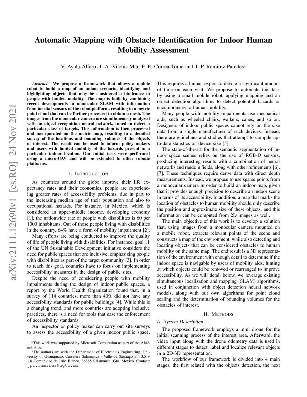 We propose a framework that allows a mobile robot to build a map of an indoor scenario, identifying and highlighting objects that may be considered a hindrance to people with limited mobility. The map is built by combining recent developments in monocular SLAM with information from inertial sensors of the robot platform, resulting in a metric point cloud that can be further processed to obtain a mesh. The images from the monocular camera are simultaneously analyzed with an object recognition neural network, tuned to detect a particular class of targets. This information is then processed and incorporated on the metric map, resulting in a detailed survey of the locations and bounding volumes of the objects of interest. The result can be used to inform policy makers and users with limited mobility of the hazards present in a particular indoor location. Our initial tests were performed using a micro-UAV and will be extended to other robotic platforms.