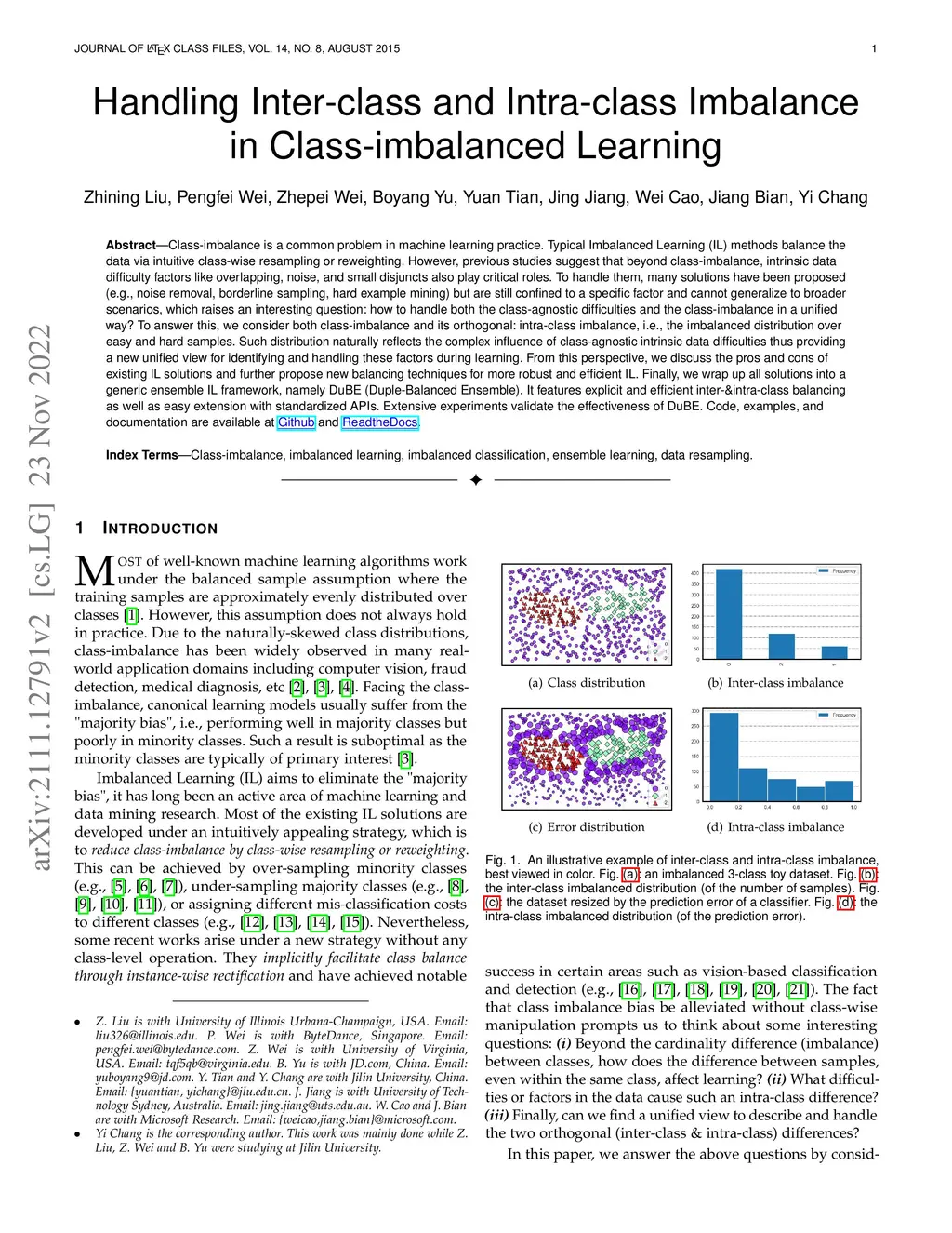 Class-imbalance is a common problem in machine learning practice. Typical Imbalanced Learning (IL) methods balance the data via intuitive class-wise resampling or reweighting. However, previous studies suggest that beyond class-imbalance, intrinsic data difficulty factors like overlapping, noise, and small disjuncts also play critical roles. To handle them, many solutions have been proposed (e.g., noise removal, borderline sampling, hard example mining) but are still confined to a specific factor and cannot generalize to broader scenarios, which raises an interesting question: how to handle both class-agnostic difficulties and the class-imbalance in a unified way? To answer this, we consider both class-imbalance and its orthogonal: intra-class imbalance, i.e., the imbalanced distribution over easy and hard samples. Such distribution naturally reflects the complex influence of class-agnostic intrinsic data difficulties thus providing a new unified view for identifying and handling these factors during learning. From this perspective, we discuss the pros and cons of existing IL solutions and further propose new balancing techniques for more robust and efficient IL. Finally, we wrap up all solutions into a generic ensemble IL framework, namely DuBE (Duple-Balanced Ensemble). It features explicit and efficient inter-\&intra-class balancing as well as easy extension with standardized APIs. Extensive experiments validate the effectiveness of DuBE. Code, examples, and documentation are available at https://github.com/AnonAuthorAI/duplebalance and https://duplebalance.readthedocs.io.