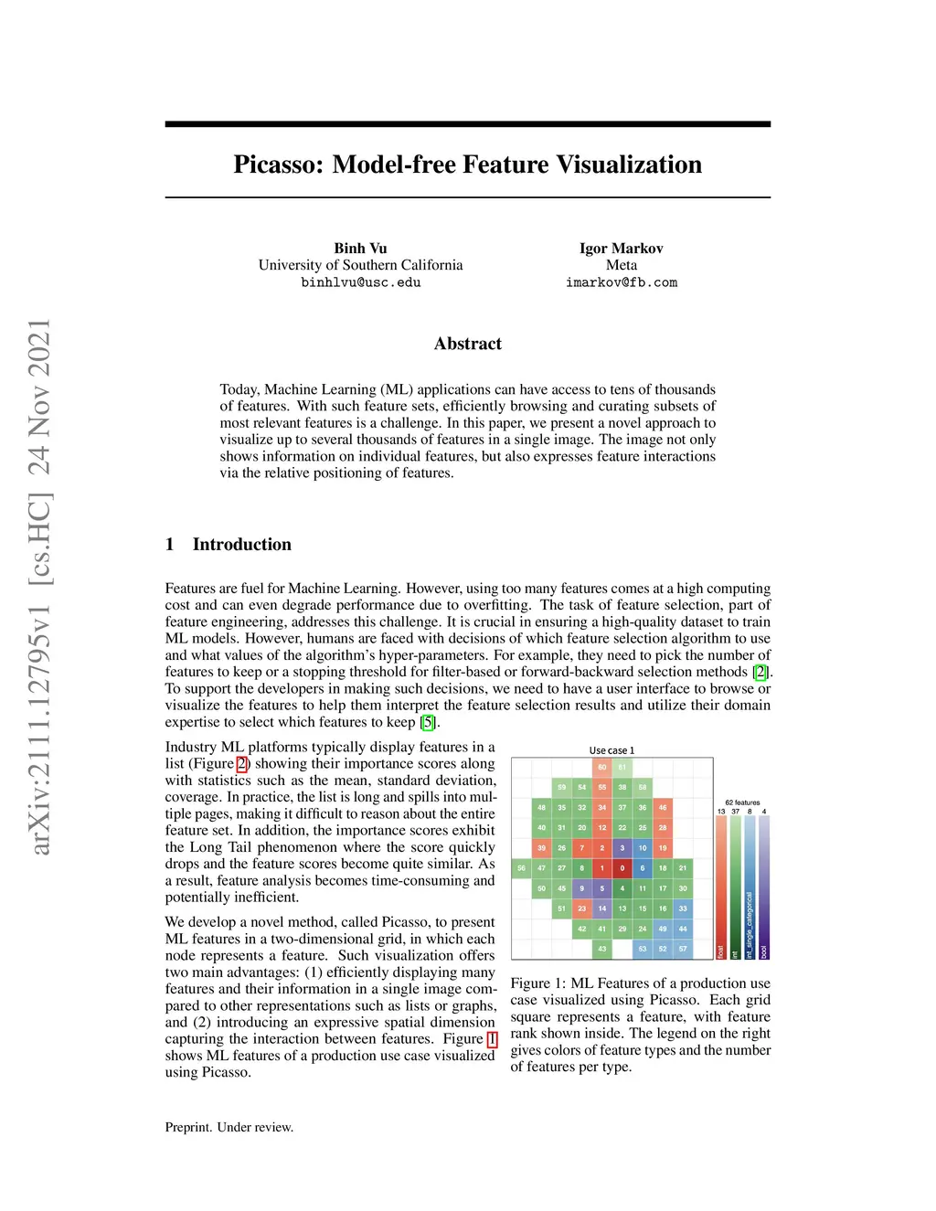 Today, Machine Learning (ML) applications can have access to tens of thousands of features. With such feature sets, efficiently browsing and curating subsets of most relevant features is a challenge. In this paper, we present a novel approach to visualize up to several thousands of features in a single image. The image not only shows information on individual features, but also expresses feature interactions via the relative positioning of features.
