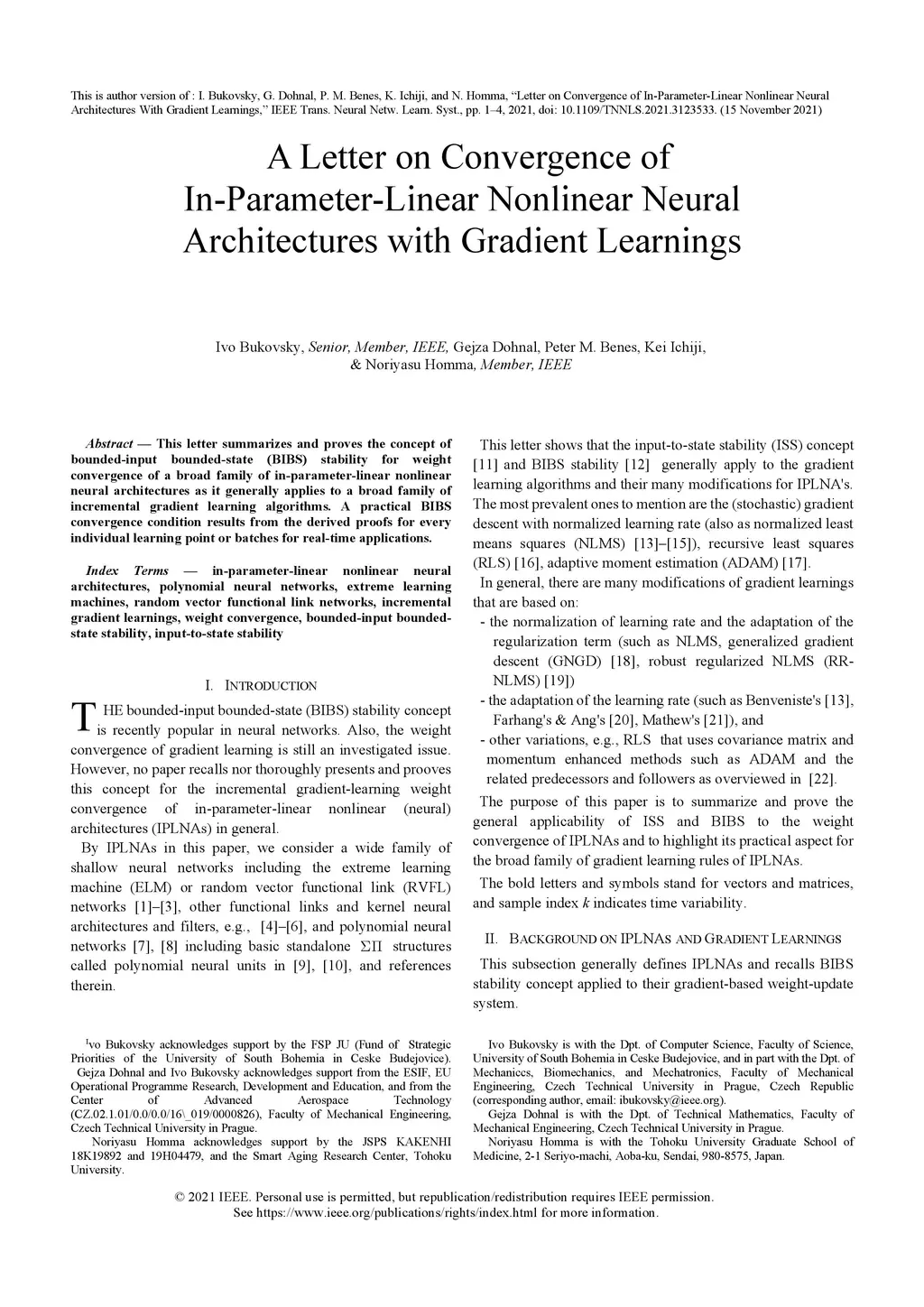 This letter summarizes and proves the concept of bounded-input bounded-state (BIBS) stability for weight convergence of a broad family of in-parameter-linear nonlinear neural architectures as it generally applies to a broad family of incremental gradient learning algorithms. A practical BIBS convergence condition results from the derived proofs for every individual learning point or batches for real-time applications.