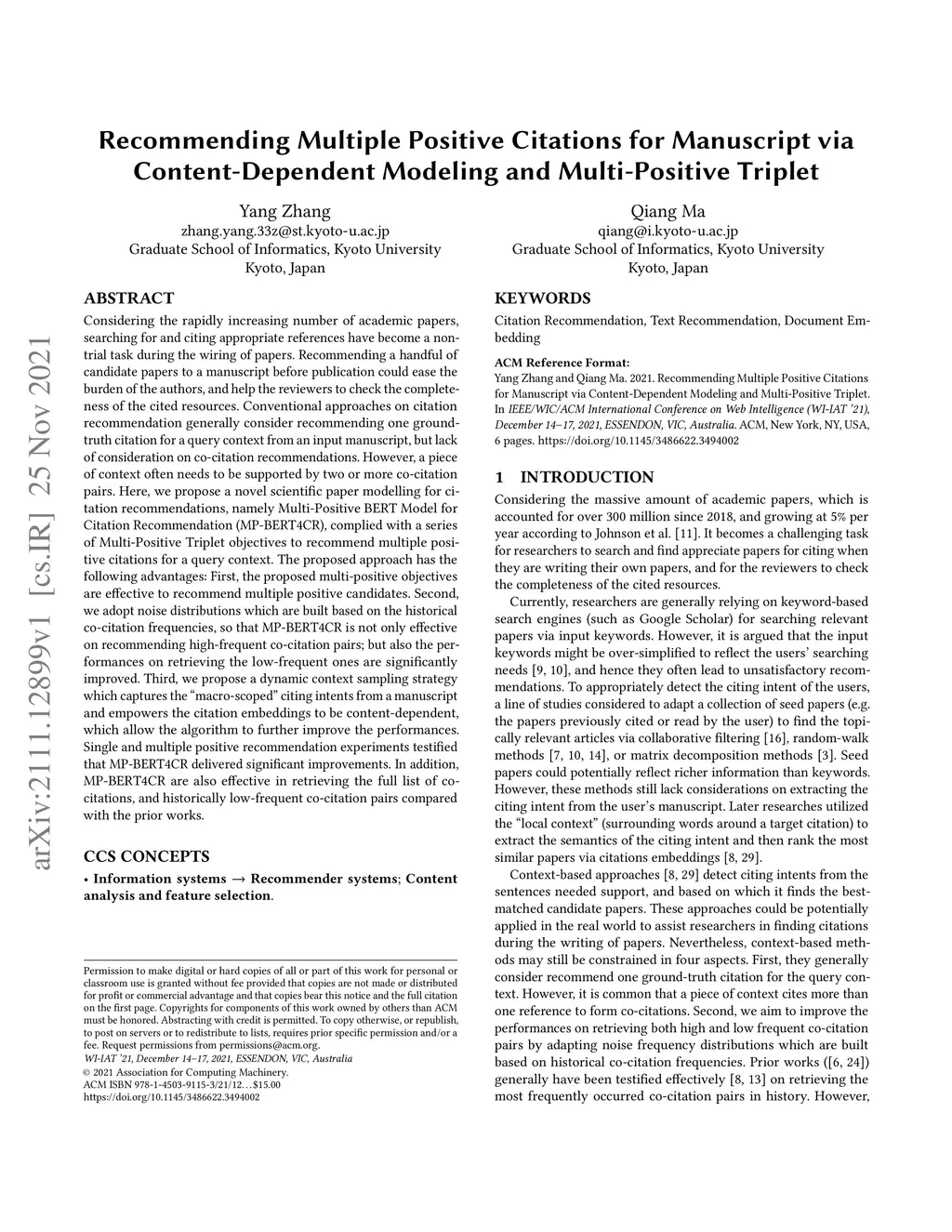 Considering the rapidly increasing number of academic papers, searching for and citing appropriate references has become a non-trial task during the wiring of papers. Recommending a handful of candidate papers to a manuscript before publication could ease the burden of the authors, and help the reviewers to check the completeness of the cited resources. Conventional approaches on citation recommendation generally consider recommending one ground-truth citation for a query context from an input manuscript, but lack of consideration on co-citation recommendations. However, a piece of context often needs to be supported by two or more co-citation pairs. Here, we propose a novel scientific paper modeling for citation recommendations, namely Multi-Positive BERT Model for Citation Recommendation (MP-BERT4CR), complied with a series of Multi-Positive Triplet objectives to recommend multiple positive citations for a query context. The proposed approach has the following advantages: First, the proposed multi-positive objectives are effective to recommend multiple positive candidates. Second, we adopt noise distributions which are built based on the historical co-citation frequencies, so that MP-BERT4CR is not only effective on recommending high-frequent co-citation pairs; but also the performances on retrieving the low-frequent ones are significantly improved. Third, we propose a dynamic context sampling strategy which captures the ``macro-scoped'' citing intents from a manuscript and empowers the citation embeddings to be content-dependent, which allow the algorithm to further improve the performances. Single and multiple positive recommendation experiments testified that MP-BERT4CR delivered significant improvements. In addition, MP-BERT4CR are also effective in retrieving the full list of co-citations, and historically low-frequent co-citation pairs compared with the prior works.