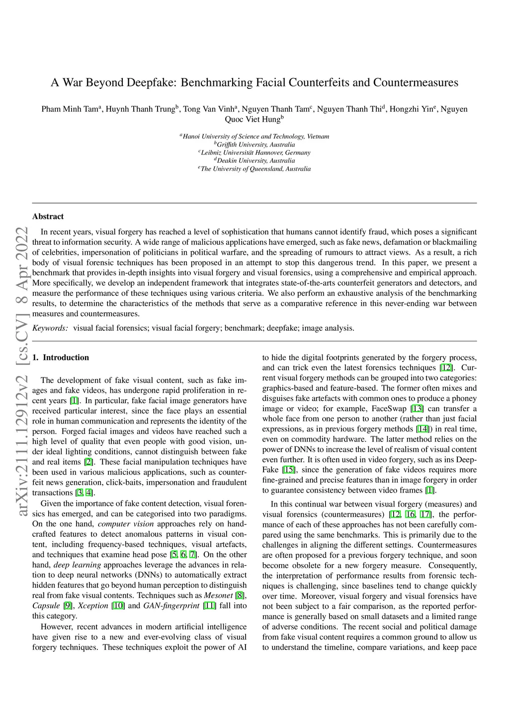 In recent years, visual forgery has reached a level of sophistication that humans cannot identify fraud, which poses a significant threat to information security. A wide range of malicious applications have emerged, such as fake news, defamation or blackmailing of celebrities, impersonation of politicians in political warfare, and the spreading of rumours to attract views. As a result, a rich body of visual forensic techniques has been proposed in an attempt to stop this dangerous trend. In this paper, we present a benchmark that provides in-depth insights into visual forgery and visual forensics, using a comprehensive and empirical approach. More specifically, we develop an independent framework that integrates state-of-the-arts counterfeit generators and detectors, and measure the performance of these techniques using various criteria. We also perform an exhaustive analysis of the benchmarking results, to determine the characteristics of the methods that serve as a comparative reference in this never-ending war between measures and countermeasures.