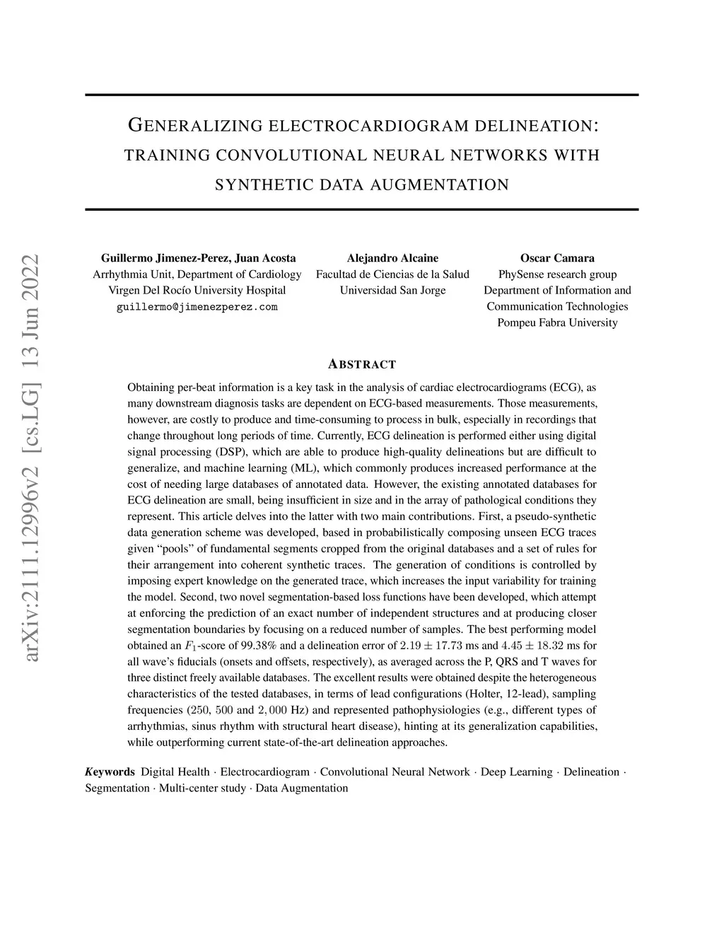 Obtaining per-beat information is a key task in the analysis of cardiac electrocardiograms (ECG), as many downstream diagnosis tasks are dependent on ECG-based measurements. Those measurements, however, are costly to produce, especially in recordings that change throughout long periods of time. However, existing annotated databases for ECG delineation are small, being insufficient in size and in the array of pathological conditions they represent. This article delves has two main contributions. First, a pseudo-synthetic data generation algorithm was developed, based in probabilistically composing ECG traces given "pools" of fundamental segments, as cropped from the original databases, and a set of rules for their arrangement into coherent synthetic traces. The generation of conditions is controlled by imposing expert knowledge on the generated trace, which increases the input variability for training the model. Second, two novel segmentation-based loss functions have been developed, which attempt at enforcing the prediction of an exact number of independent structures and at producing closer segmentation boundaries by focusing on a reduced number of samples. The best performing model obtained an -score of 99.38\% and a delineation error of ms and ms for all wave's fiducials (onsets and offsets, respectively), as averaged across the P, QRS and T waves for three distinct freely available databases. The excellent results were obtained despite the heterogeneous characteristics of the tested databases, in terms of lead configurations (Holter, 12-lead), sampling frequencies (, and Hz) and represented pathophysiologies (e.g., different types of arrhythmias, sinus rhythm with structural heart disease), hinting at its generalization capabilities, while outperforming current state-of-the-art delineation approaches.