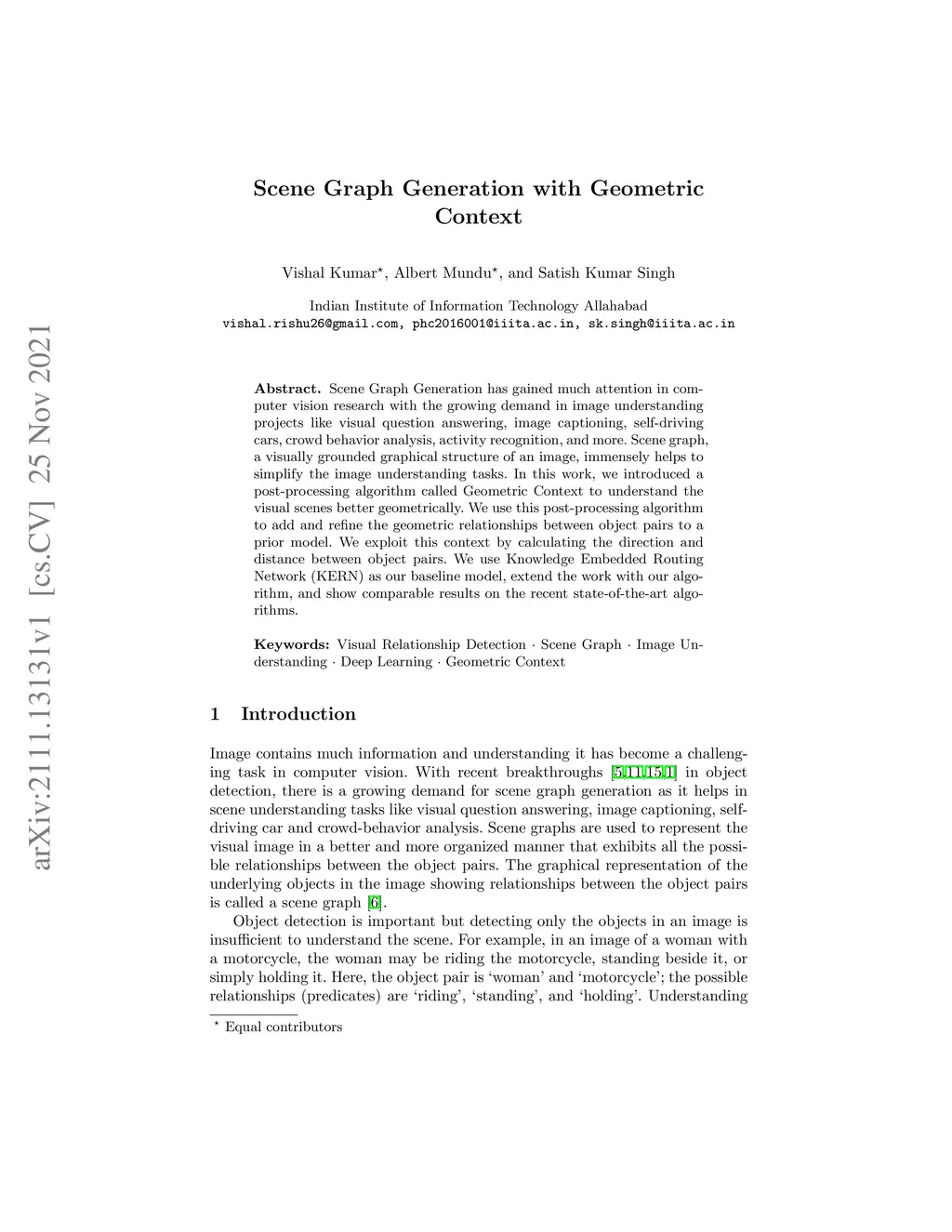 Scene Graph Generation has gained much attention in computer vision research with the growing demand in image understanding projects like visual question answering, image captioning, self-driving cars, crowd behavior analysis, activity recognition, and more. Scene graph, a visually grounded graphical structure of an image, immensely helps to simplify the image understanding tasks. In this work, we introduced a post-processing algorithm called Geometric Context to understand the visual scenes better geometrically. We use this post-processing algorithm to add and refine the geometric relationships between object pairs to a prior model. We exploit this context by calculating the direction and distance between object pairs. We use Knowledge Embedded Routing Network (KERN) as our baseline model, extend the work with our algorithm, and show comparable results on the recent state-of-the-art algorithms.
