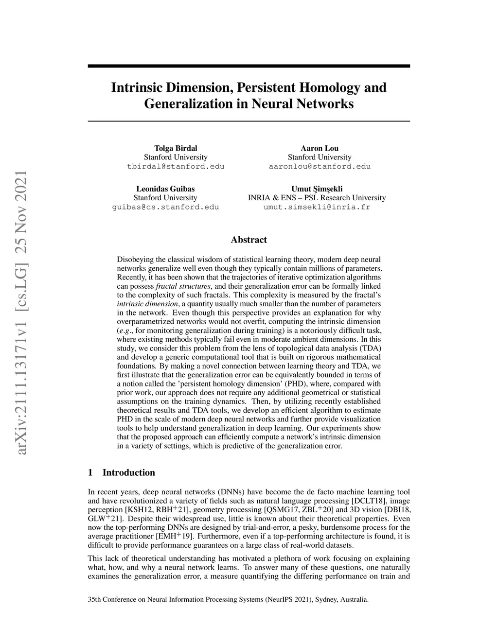 Intrinsic Dimension, Persistent Homology and Generalization in Neural