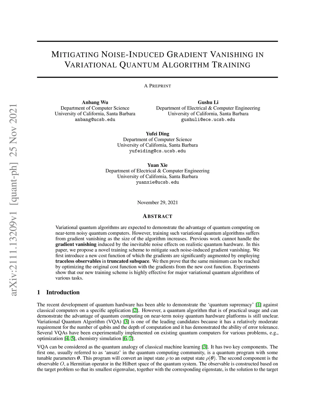 Variational quantum algorithms are expected to demonstrate the advantage of quantum computing on near-term noisy quantum computers. However, training such variational quantum algorithms suffers from gradient vanishing as the size of the algorithm increases. Previous work cannot handle the gradient vanishing induced by the inevitable noise effects on realistic quantum hardware. In this paper, we propose a novel training scheme to mitigate such noise-induced gradient vanishing. We first introduce a new cost function of which the gradients are significantly augmented by employing traceless observables in truncated subspace. We then prove that the same minimum can be reached by optimizing the original cost function with the gradients from the new cost function. Experiments show that our new training scheme is highly effective for major variational quantum algorithms of various tasks.