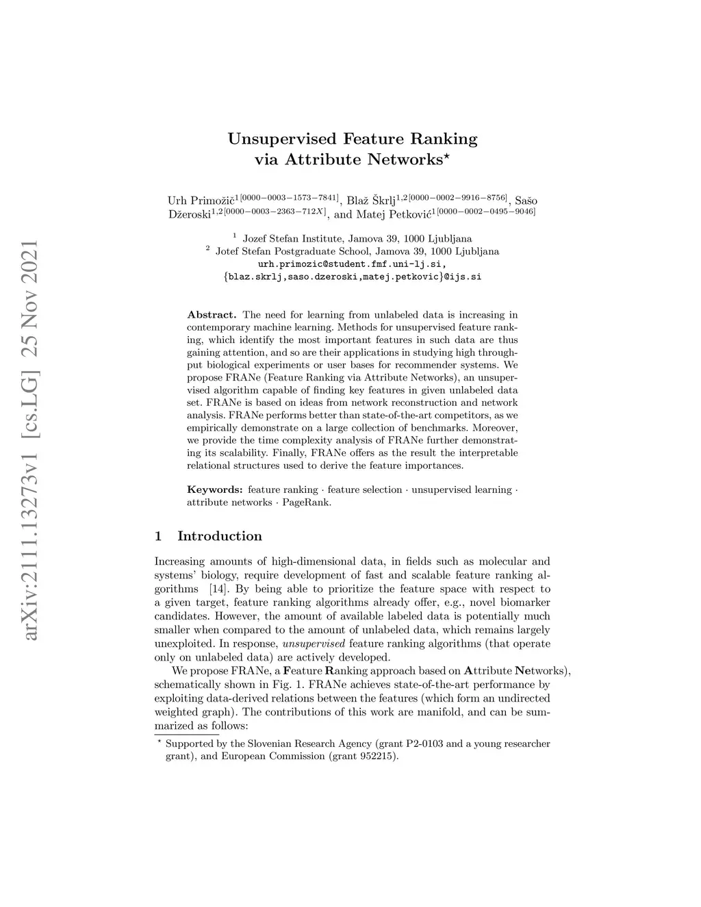 The need for learning from unlabeled data is increasing in contemporary machine learning. Methods for unsupervised feature ranking, which identify the most important features in such data are thus gaining attention, and so are their applications in studying high throughput biological experiments or user bases for recommender systems. We propose FRANe (Feature Ranking via Attribute Networks), an unsupervised algorithm capable of finding key features in given unlabeled data set. FRANe is based on ideas from network reconstruction and network analysis. FRANe performs better than state-of-the-art competitors, as we empirically demonstrate on a large collection of benchmarks. Moreover, we provide the time complexity analysis of FRANe further demonstrating its scalability. Finally, FRANe offers as the result the interpretable relational structures used to derive the feature importances.