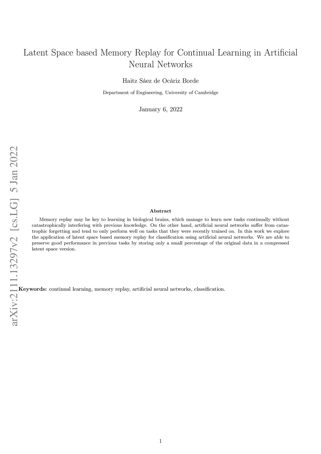 Latent Space based Memory Replay for Continual Learning in Artificial