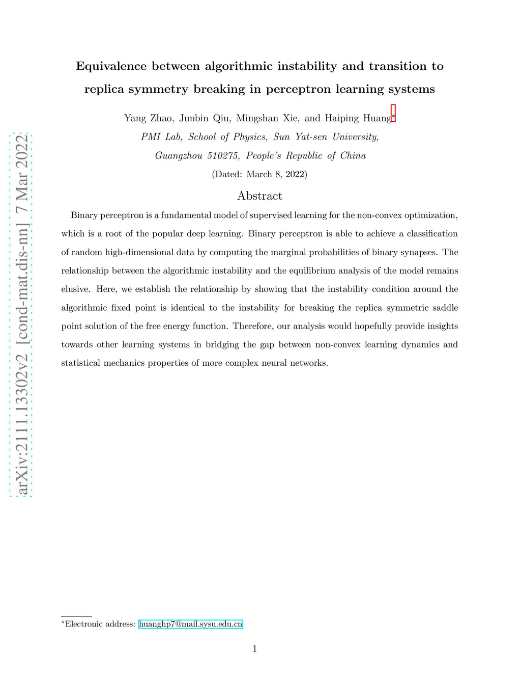 Binary perceptron is a fundamental model of supervised learning for the non-convex optimization, which is a root of the popular deep learning. Binary perceptron is able to achieve a classification of random high-dimensional data by computing the marginal probabilities of binary synapses. The relationship between the algorithmic instability and the equilibrium analysis of the model remains elusive. Here, we establish the relationship by showing that the instability condition around the algorithmic fixed point is identical to the instability for breaking the replica symmetric saddle point solution of the free energy function. Therefore, our analysis provides insights towards bridging the gap between non-convex learning dynamics and statistical mechanics properties of more complex neural networks.