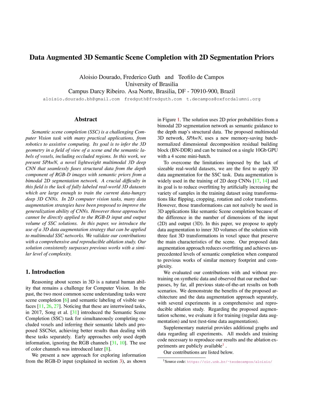 Semantic scene completion (SSC) is a challenging Computer Vision task with many practical applications, from robotics to assistive computing. Its goal is to infer the 3D geometry in a field of view of a scene and the semantic labels of voxels, including occluded regions. In this work, we present SPAwN, a novel lightweight multimodal 3D deep CNN that seamlessly fuses structural data from the depth component of RGB-D images with semantic priors from a bimodal 2D segmentation network. A crucial difficulty in this field is the lack of fully labeled real-world 3D datasets which are large enough to train the current data-hungry deep 3D CNNs. In 2D computer vision tasks, many data augmentation strategies have been proposed to improve the generalization ability of CNNs. However those approaches cannot be directly applied to the RGB-D input and output volume of SSC solutions. In this paper, we introduce the use of a 3D data augmentation strategy that can be applied to multimodal SSC networks. We validate our contributions with a comprehensive and reproducible ablation study. Our solution consistently surpasses previous works with a similar level of complexity.