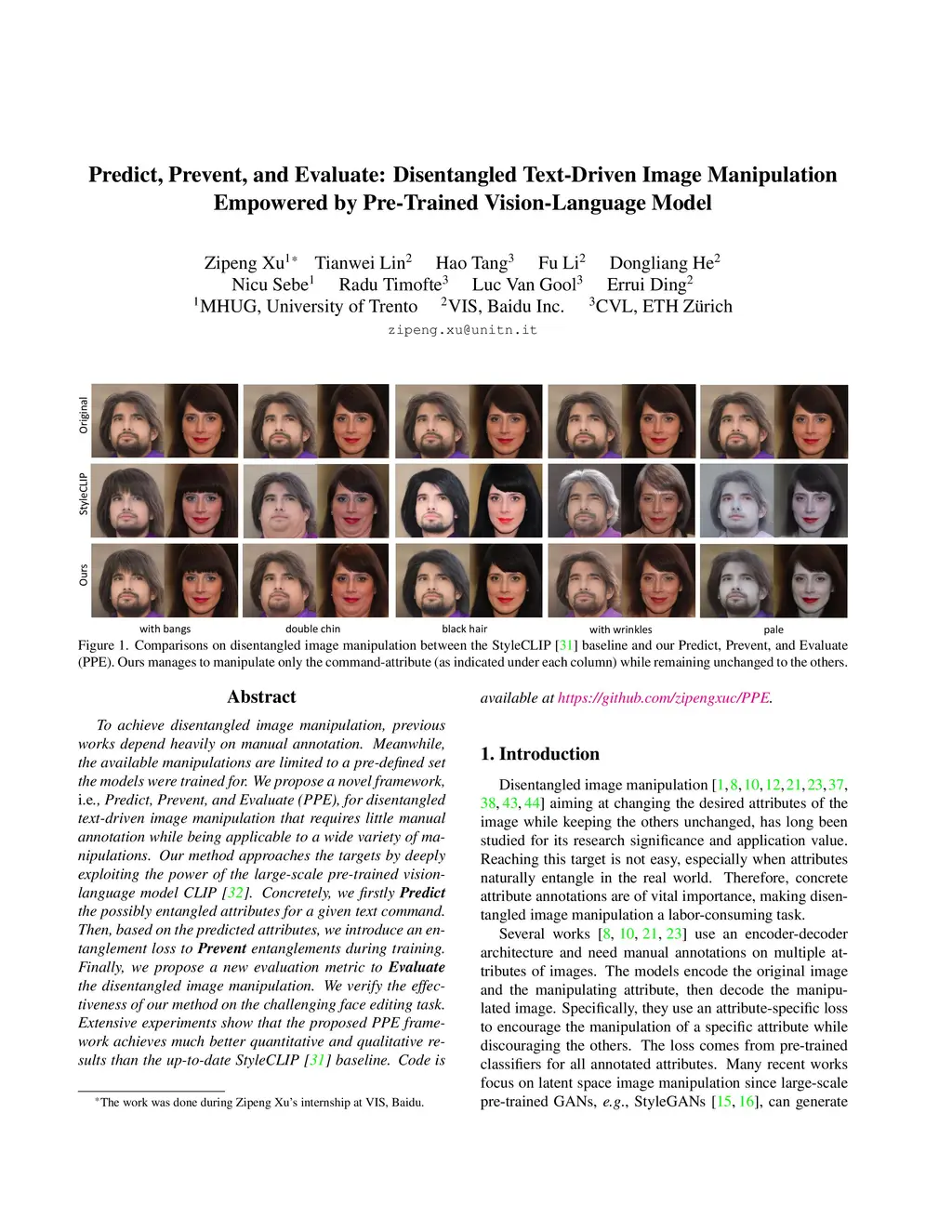 To achieve disentangled image manipulation, previous works depend heavily on manual annotation. Meanwhile, the available manipulations are limited to a pre-defined set the models were trained for. We propose a novel framework, i.e., Predict, Prevent, and Evaluate (PPE), for disentangled text-driven image manipulation that requires little manual annotation while being applicable to a wide variety of manipulations. Our method approaches the targets by deeply exploiting the power of the large-scale pre-trained vision-language model CLIP. Concretely, we firstly Predict the possibly entangled attributes for a given text command. Then, based on the predicted attributes, we introduce an entanglement loss to Prevent entanglements during training. Finally, we propose a new evaluation metric to Evaluate the disentangled image manipulation. We verify the effectiveness of our method on the challenging face editing task. Extensive experiments show that the proposed PPE framework achieves much better quantitative and qualitative results than the up-to-date StyleCLIP baseline.