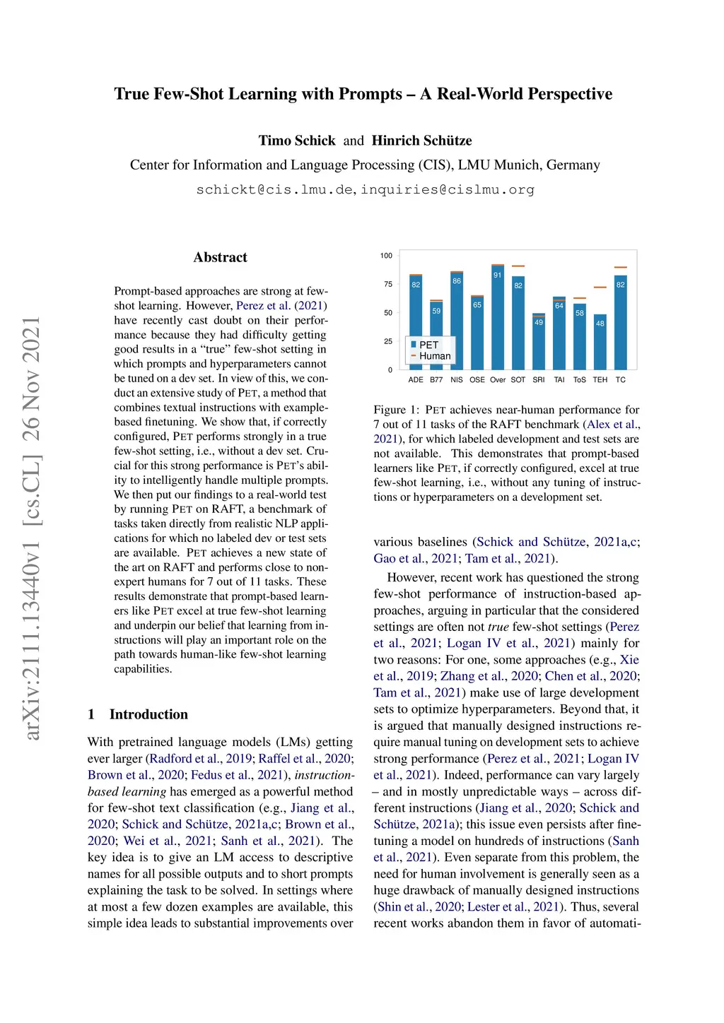 Prompt-based approaches are strong at few-shot learning. However, Perez et al. (2021) have recently cast doubt on their performance because they had difficulty getting good results in a "true" few-shot setting in which prompts and hyperparameters cannot be tuned on a dev set. In view of this, we conduct an extensive study of PET, a method that combines textual instructions with example-based finetuning. We show that, if correctly configured, PET performs strongly in a true few-shot setting, i.e., without a dev set. Crucial for this strong performance is PET's ability to intelligently handle multiple prompts. We then put our findings to a real-world test by running PET on RAFT, a benchmark of tasks taken directly from realistic NLP applications for which no labeled dev or test sets are available. PET achieves a new state of the art on RAFT and performs close to non-expert humans for 7 out of 11 tasks. These results demonstrate that prompt-based learners like PET excel at true few-shot learning and underpin our belief that learning from instructions will play an important role on the path towards human-like few-shot learning capabilities.