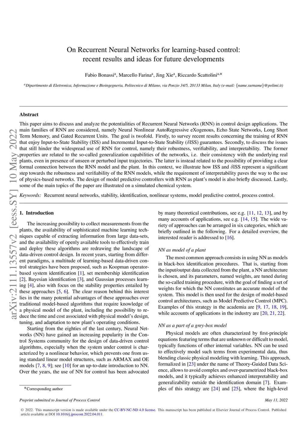 This paper aims to discuss and analyze the potentialities of Recurrent Neural Networks (RNN) in control design applications. The main families of RNN are considered, namely Neural Nonlinear AutoRegressive eXogenous, (NNARX), Echo State Networks (ESN), Long Short Term Memory (LSTM), and Gated Recurrent Units (GRU). The goal is twofold. Firstly, to survey recent results concerning the training of RNN that enjoy Input-to-State Stability (ISS) and Incremental Input-to-State Stability (ISS) guarantees. Secondly, to discuss the issues that still hinder the widespread use of RNN for control, namely their robustness, verifiability, and interpretability. The former properties are related to the so-called generalization capabilities of the networks, i.e. their consistency with the underlying real plants, even in presence of unseen or perturbed input trajectories. The latter is instead related to the possibility of providing a clear formal connection between the RNN model and the plant. In this context, we illustrate how ISS and ISS represent a significant step towards the robustness and verifiability of the RNN models, while the requirement of interpretability paves the way to the use of physics-based networks. The design of model predictive controllers with RNN as plant's model is also briefly discussed. Lastly, some of the main topics of the paper are illustrated on a simulated chemical system.