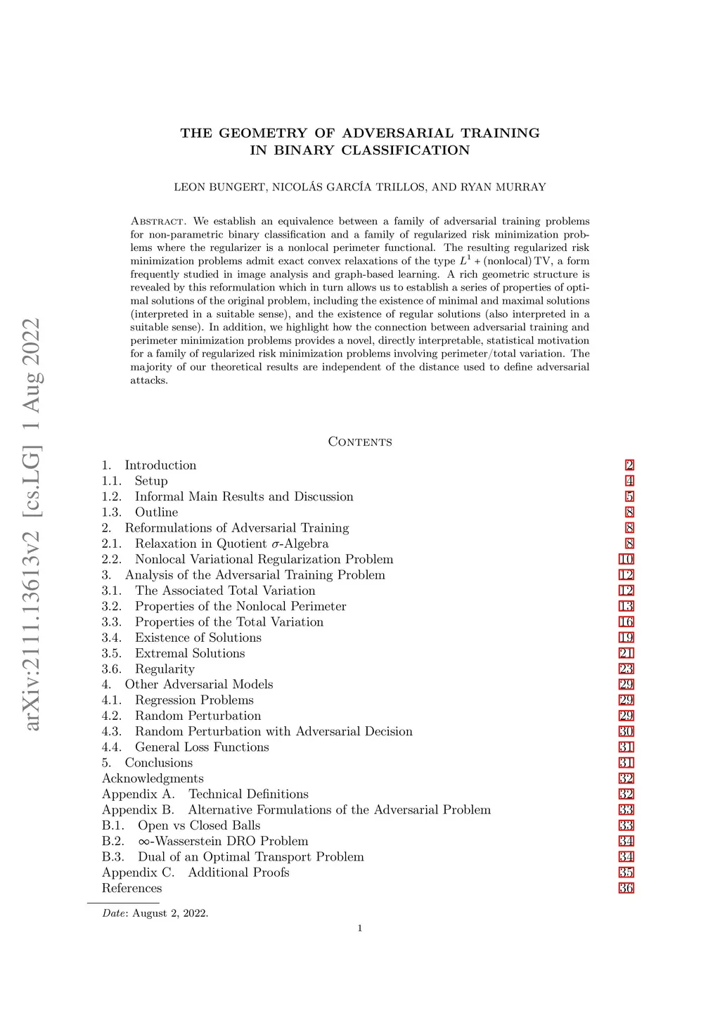 We establish an equivalence between a family of adversarial training problems for non-parametric binary classification and a family of regularized risk minimization problems where the regularizer is a nonlocal perimeter functional. The resulting regularized risk minimization problems admit exact convex relaxations of the type (nonlocal) , a form frequently studied in image analysis and graph-based learning. A rich geometric structure is revealed by this reformulation which in turn allows us to establish a series of properties of optimal solutions of the original problem, including the existence of minimal and maximal solutions (interpreted in a suitable sense), and the existence of regular solutions (also interpreted in a suitable sense). In addition, we highlight how the connection between adversarial training and perimeter minimization problems provides a novel, directly interpretable, statistical motivation for a family of regularized risk minimization problems involving perimeter/total variation. The majority of our theoretical results are independent of the distance used to define adversarial attacks.