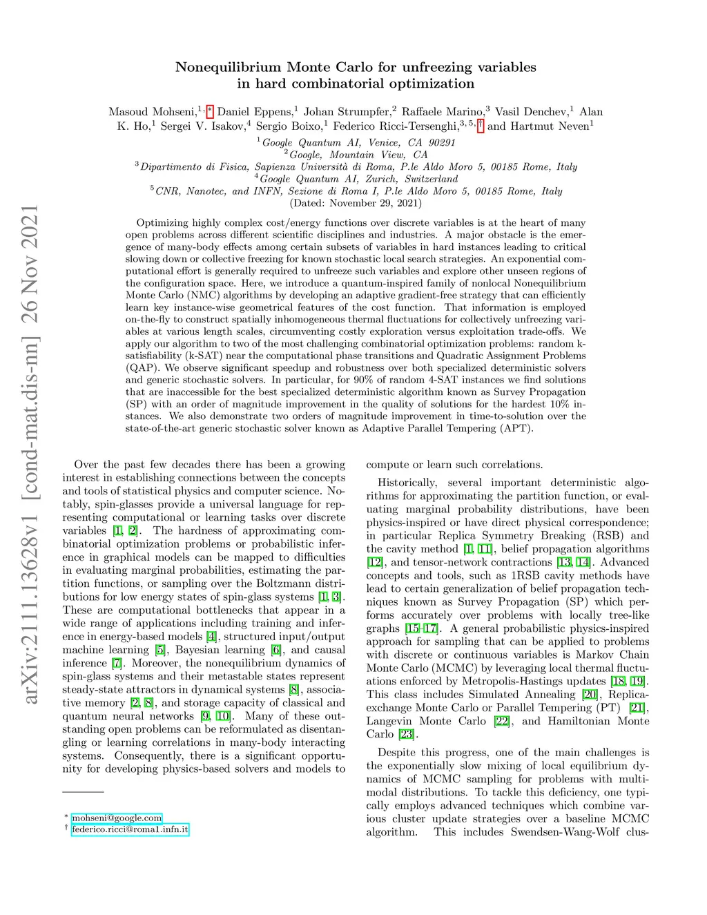 Optimizing highly complex cost/energy functions over discrete variables is at the heart of many open problems across different scientific disciplines and industries. A major obstacle is the emergence of many-body effects among certain subsets of variables in hard instances leading to critical slowing down or collective freezing for known stochastic local search strategies. An exponential computational effort is generally required to unfreeze such variables and explore other unseen regions of the configuration space. Here, we introduce a quantum-inspired family of nonlocal Nonequilibrium Monte Carlo (NMC) algorithms by developing an adaptive gradient-free strategy that can efficiently learn key instance-wise geometrical features of the cost function. That information is employed on-the-fly to construct spatially inhomogeneous thermal fluctuations for collectively unfreezing variables at various length scales, circumventing costly exploration versus exploitation trade-offs. We apply our algorithm to two of the most challenging combinatorial optimization problems: random k-satisfiability (k-SAT) near the computational phase transitions and Quadratic Assignment Problems (QAP). We observe significant speedup and robustness over both specialized deterministic solvers and generic stochastic solvers. In particular, for 90% of random 4-SAT instances we find solutions that are inaccessible for the best specialized deterministic algorithm known as Survey Propagation (SP) with an order of magnitude improvement in the quality of solutions for the hardest 10% instances. We also demonstrate two orders of magnitude improvement in time-to-solution over the state-of-the-art generic stochastic solver known as Adaptive Parallel Tempering (APT).