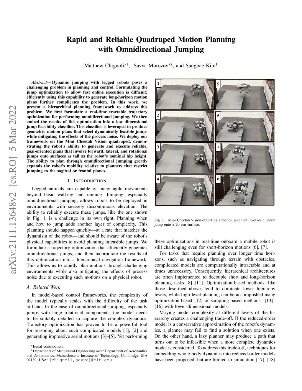 Dynamic jumping with legged robots poses a challenging problem in planning and control. Formulating the jump optimization to allow fast online execution is difficult; efficiently using this capability to generate long-horizon motion plans further complicates the problem. In this work, we present a hierarchical planning framework to address this problem. We first formulate a real-time tractable trajectory optimization for performing omnidirectional jumping. We then embed the results of this optimization into a low dimensional jump feasibility classifier. This classifier is leveraged to produce geometric motion plans that select dynamically feasible jumps while mitigating the effects of the process noise. We deploy our framework on the Mini Cheetah Vision quadruped, demonstrating the robot's ability to generate and execute reliable, goal-oriented plans that involve forward, lateral, and rotational jumps onto surfaces as tall as the robot's nominal hip height. The ability to plan through omnidirectional jumping greatly expands the robot's mobility relative to planners that restrict jumping to the sagittal or frontal planes.