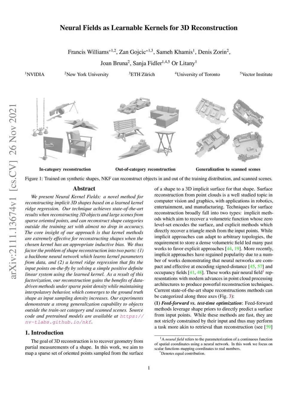 We present Neural Kernel Fields: a novel method for reconstructing implicit 3D shapes based on a learned kernel ridge regression. Our technique achieves state-of-the-art results when reconstructing 3D objects and large scenes from sparse oriented points, and can reconstruct shape categories outside the training set with almost no drop in accuracy. The core insight of our approach is that kernel methods are extremely effective for reconstructing shapes when the chosen kernel has an appropriate inductive bias. We thus factor the problem of shape reconstruction into two parts: (1) a backbone neural network which learns kernel parameters from data, and (2) a kernel ridge regression that fits the input points on-the-fly by solving a simple positive definite linear system using the learned kernel. As a result of this factorization, our reconstruction gains the benefits of data-driven methods under sparse point density while maintaining interpolatory behavior, which converges to the ground truth shape as input sampling density increases. Our experiments demonstrate a strong generalization capability to objects outside the train-set category and scanned scenes. Source code and pretrained models are available at https://nv-tlabs.github.io/nkf.