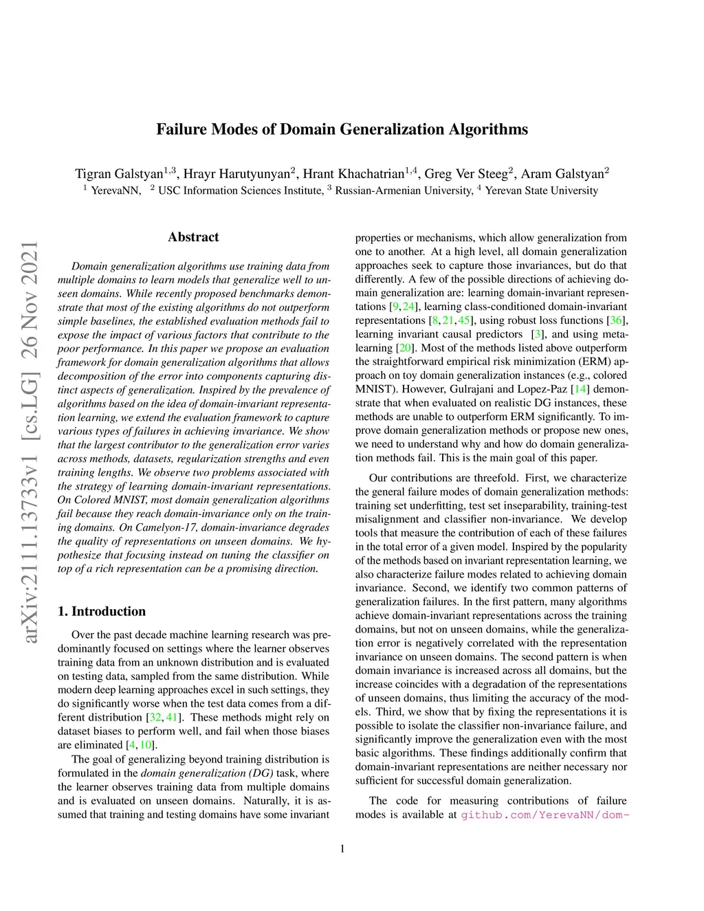 Domain generalization algorithms use training data from multiple domains to learn models that generalize well to unseen domains. While recently proposed benchmarks demonstrate that most of the existing algorithms do not outperform simple baselines, the established evaluation methods fail to expose the impact of various factors that contribute to the poor performance. In this paper we propose an evaluation framework for domain generalization algorithms that allows decomposition of the error into components capturing distinct aspects of generalization. Inspired by the prevalence of algorithms based on the idea of domain-invariant representation learning, we extend the evaluation framework to capture various types of failures in achieving invariance. We show that the largest contributor to the generalization error varies across methods, datasets, regularization strengths and even training lengths. We observe two problems associated with the strategy of learning domain-invariant representations. On Colored MNIST, most domain generalization algorithms fail because they reach domain-invariance only on the training domains. On Camelyon-17, domain-invariance degrades the quality of representations on unseen domains. We hypothesize that focusing instead on tuning the classifier on top of a rich representation can be a promising direction.