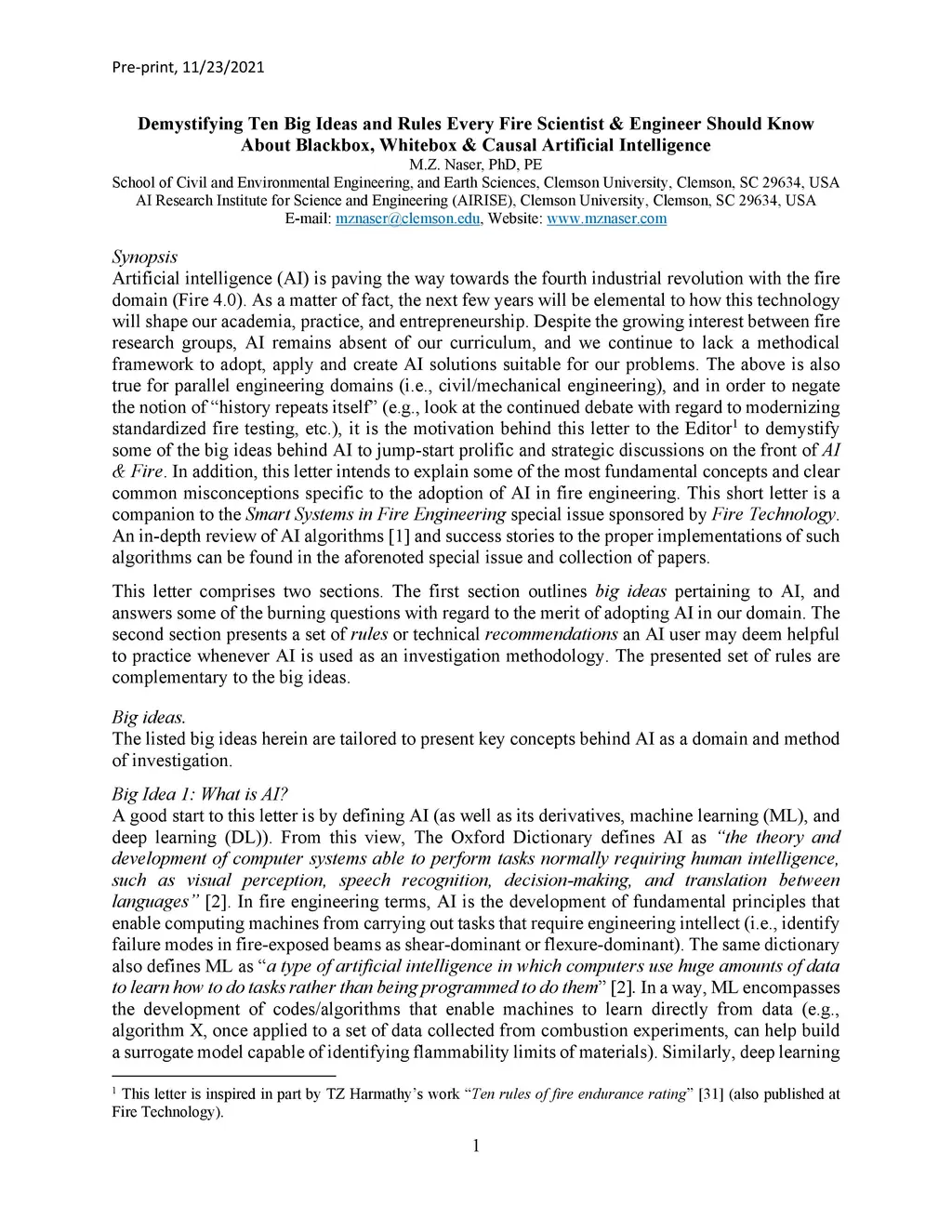 Artificial intelligence (AI) is paving the way towards the fourth industrial revolution with the fire domain (Fire 4.0). As a matter of fact, the next few years will be elemental to how this technology will shape our academia, practice, and entrepreneurship. Despite the growing interest between fire research groups, AI remains absent of our curriculum, and we continue to lack a methodical framework to adopt, apply and create AI solutions suitable for our problems. The above is also true for parallel engineering domains (i.e., civil/mechanical engineering), and in order to negate the notion of history repeats itself (e.g., look at the continued debate with regard to modernizing standardized fire testing, etc.), it is the motivation behind this letter to the Editor to demystify some of the big ideas behind AI to jump-start prolific and strategic discussions on the front of AI & Fire. In addition, this letter intends to explain some of the most fundamental concepts and clear common misconceptions specific to the adoption of AI in fire engineering. This short letter is a companion to the Smart Systems in Fire Engineering special issue sponsored by Fire Technology. An in-depth review of AI algorithms [1] and success stories to the proper implementations of such algorithms can be found in the aforenoted special issue and collection of papers. This letter comprises two sections. The first section outlines big ideas pertaining to AI, and answers some of the burning questions with regard to the merit of adopting AI in our domain. The second section presents a set of rules or technical recommendations an AI user may deem helpful to practice whenever AI is used as an investigation methodology. The presented set of rules are complementary to the big ideas.