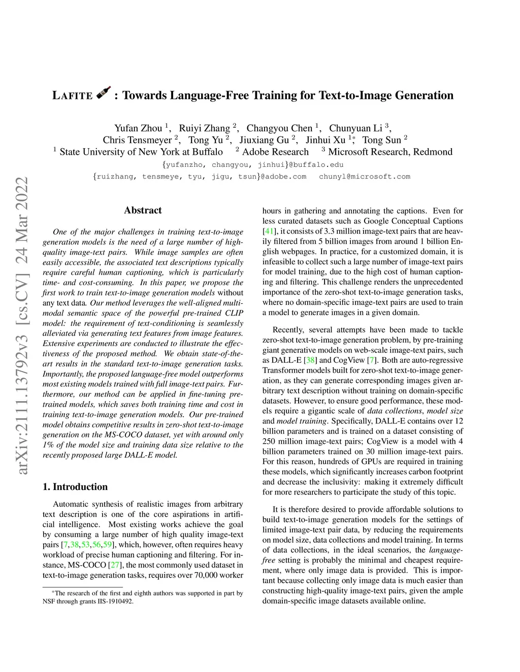 LAFITE: Towards Language-Free Training for Text-to-Image Generation