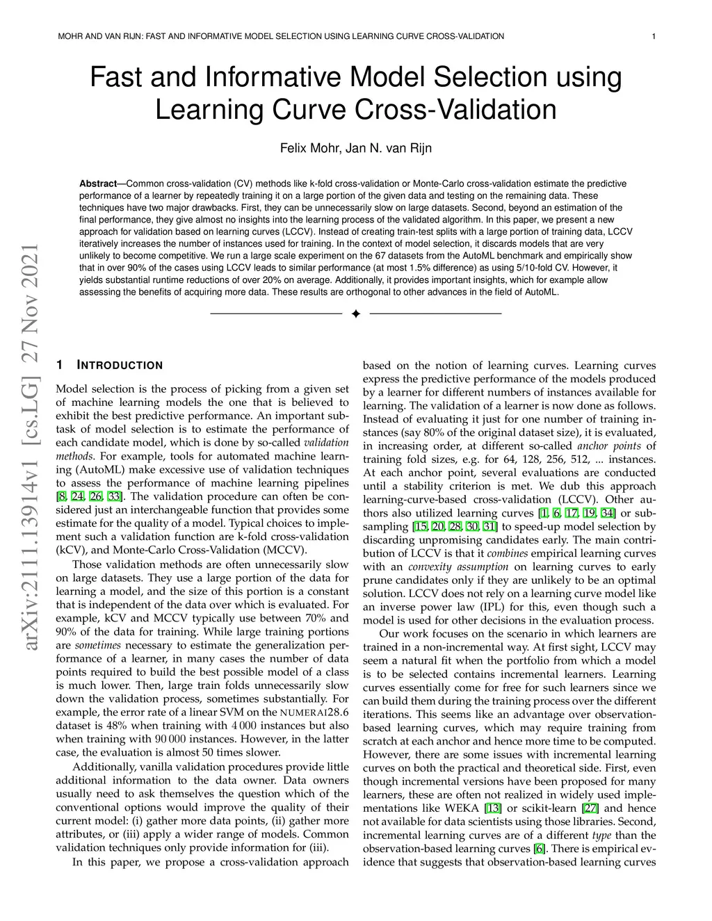 Common cross-validation (CV) methods like k-fold cross-validation or Monte-Carlo cross-validation estimate the predictive performance of a learner by repeatedly training it on a large portion of the given data and testing on the remaining data. These techniques have two major drawbacks. First, they can be unnecessarily slow on large datasets. Second, beyond an estimation of the final performance, they give almost no insights into the learning process of the validated algorithm. In this paper, we present a new approach for validation based on learning curves (LCCV). Instead of creating train-test splits with a large portion of training data, LCCV iteratively increases the number of instances used for training. In the context of model selection, it discards models that are very unlikely to become competitive. We run a large scale experiment on the 67 datasets from the AutoML benchmark and empirically show that in over 90% of the cases using LCCV leads to similar performance (at most 1.5% difference) as using 5/10-fold CV. However, it yields substantial runtime reductions of over 20% on average. Additionally, it provides important insights, which for example allow assessing the benefits of acquiring more data. These results are orthogonal to other advances in the field of AutoML.