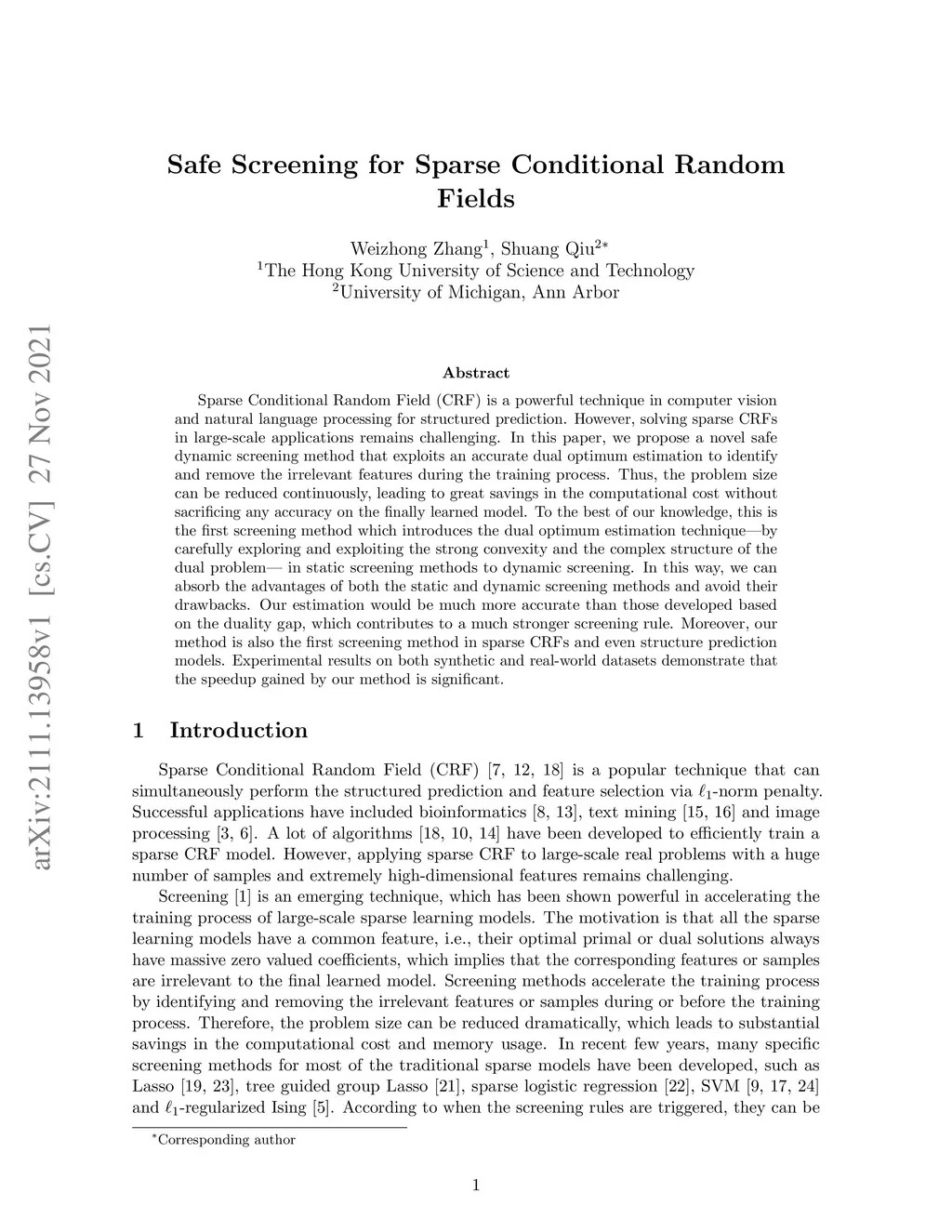 Sparse Conditional Random Field (CRF) is a powerful technique in computer vision and natural language processing for structured prediction. However, solving sparse CRFs in large-scale applications remains challenging. In this paper, we propose a novel safe dynamic screening method that exploits an accurate dual optimum estimation to identify and remove the irrelevant features during the training process. Thus, the problem size can be reduced continuously, leading to great savings in the computational cost without sacrificing any accuracy on the finally learned model. To the best of our knowledge, this is the first screening method which introduces the dual optimum estimation technique -- by carefully exploring and exploiting the strong convexity and the complex structure of the dual problem -- in static screening methods to dynamic screening. In this way, we can absorb the advantages of both the static and dynamic screening methods and avoid their drawbacks. Our estimation would be much more accurate than those developed based on the duality gap, which contributes to a much stronger screening rule. Moreover, our method is also the first screening method in sparse CRFs and even structure prediction models. Experimental results on both synthetic and real-world datasets demonstrate that the speedup gained by our method is significant.