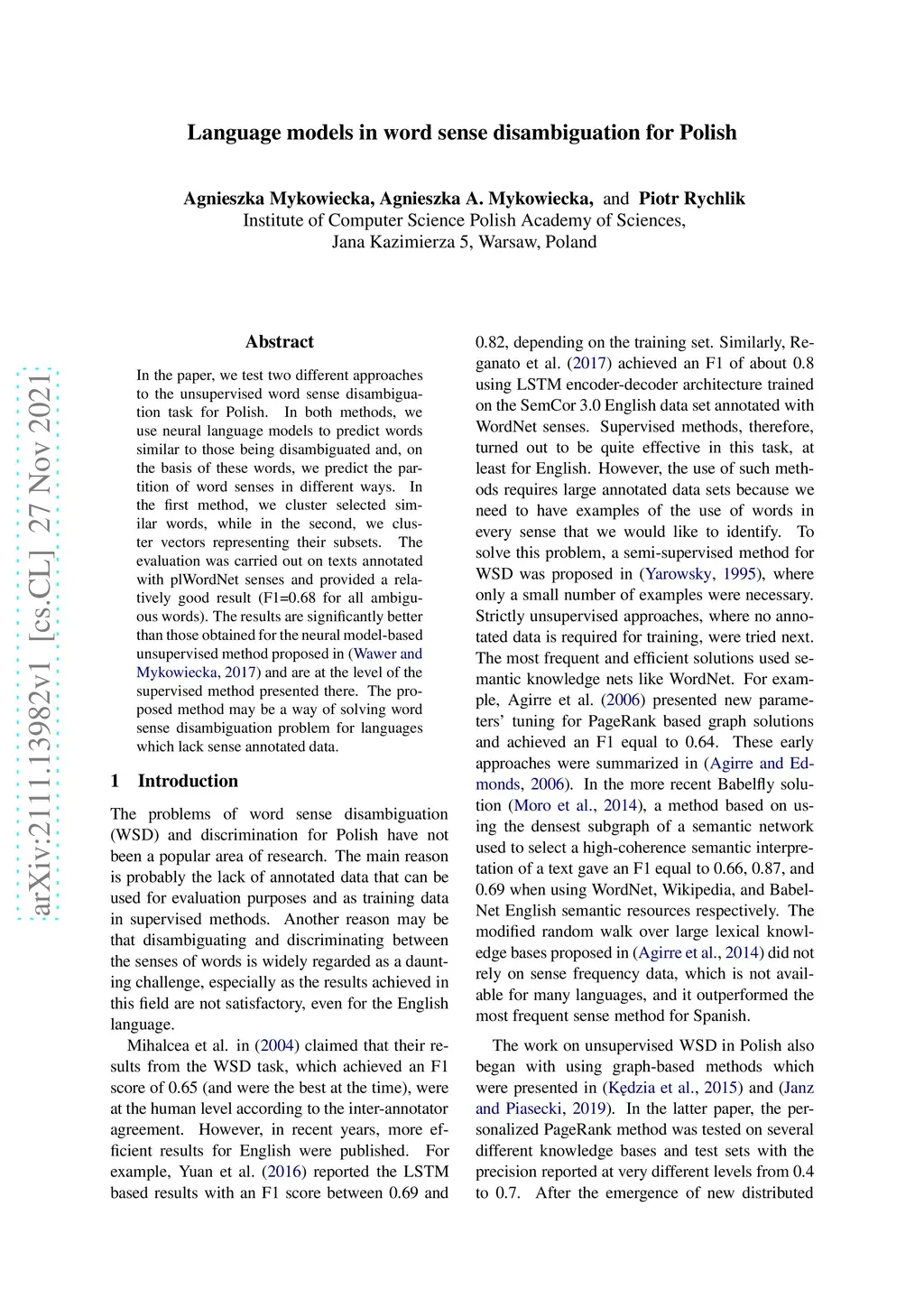In the paper, we test two different approaches to the {unsupervised} word sense disambiguation task for Polish. In both methods, we use neural language models to predict words similar to those being disambiguated and, on the basis of these words, we predict the partition of word senses in different ways. In the first method, we cluster selected similar words, while in the second, we cluster vectors representing their subsets. The evaluation was carried out on texts annotated with plWordNet senses and provided a relatively good result (F1=0.68 for all ambiguous words). The results are significantly better than those obtained for the neural model-based unsupervised method proposed in \cite{waw:myk:17:Sense} and are at the level of the supervised method presented there. The proposed method may be a way of solving word sense disambiguation problem for languages that lack sense annotated data.
