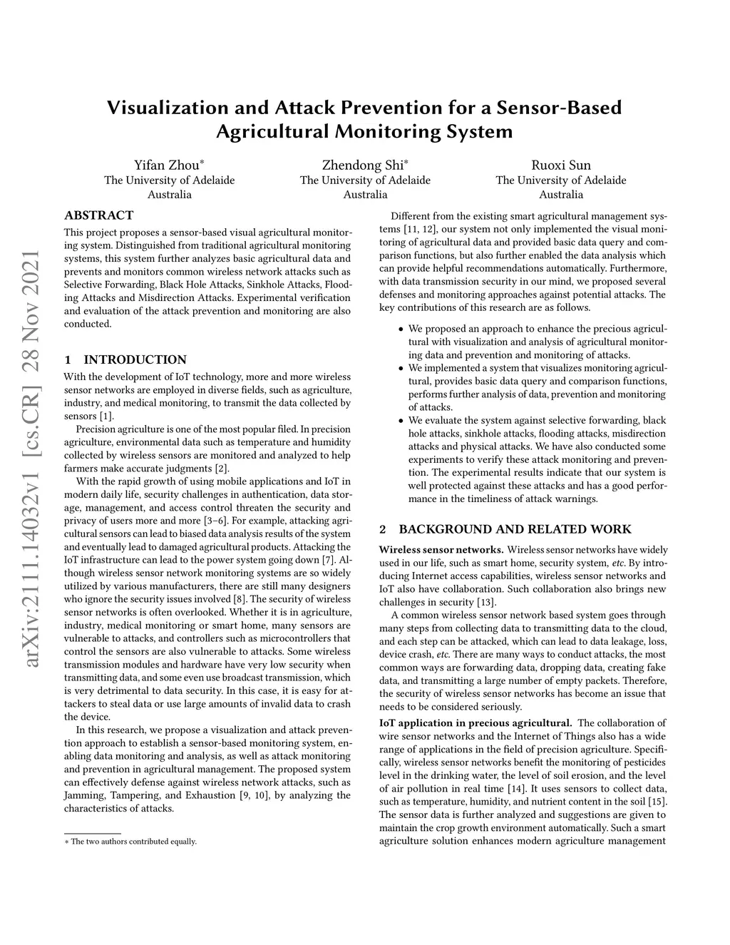 This project proposes a sensor-based visual agricultural monitoring system. Distinguished from traditional agricultural monitoring systems, this system further analyzes basic agricultural data and prevents and monitors common wireless network attacks such as Selective Forwarding, Black Hole Attacks, Sinkhole Attacks, Flooding Attacks and Misdirection Attacks. Experimental verification and evaluation of the attack prevention and monitoring are also conducted.