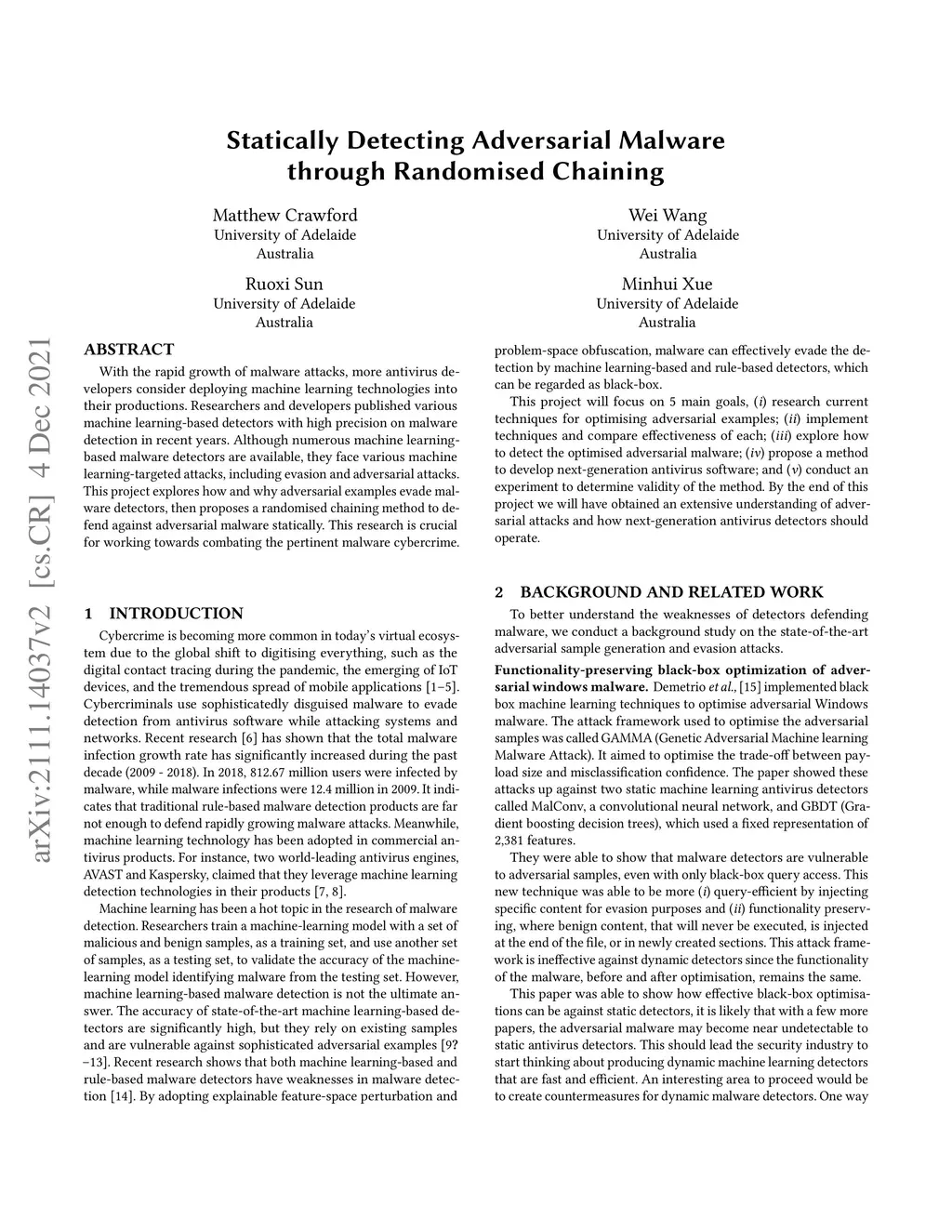 Statically Detecting Adversarial Malware through Randomised Chaining