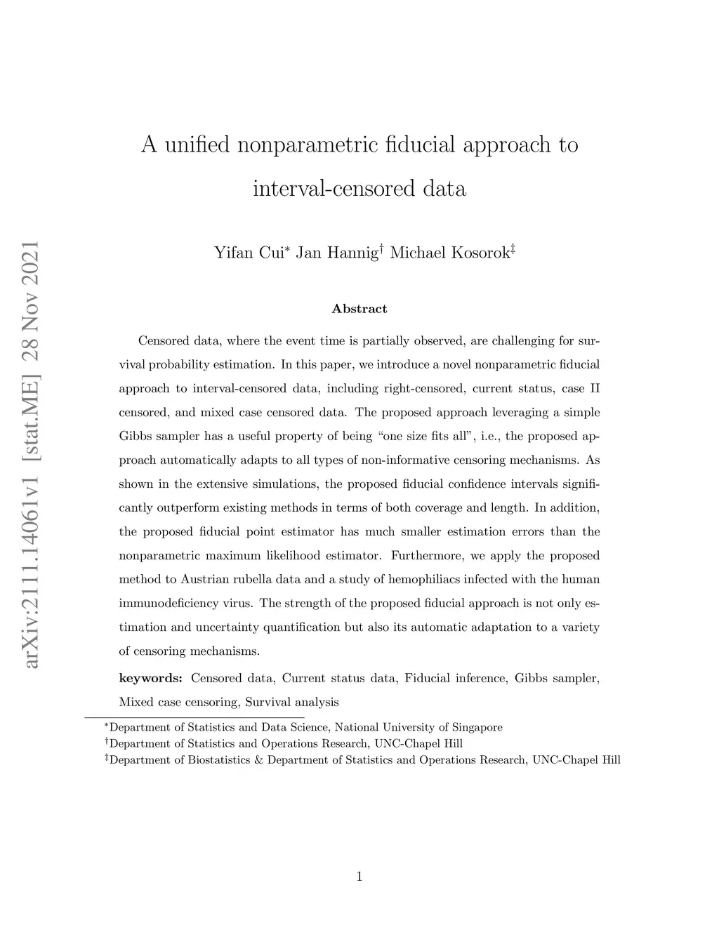 Censored data, where the event time is partially observed, are challenging for survival probability estimation. In this paper, we introduce a novel nonparametric fiducial approach to interval-censored data, including right-censored, current status, case II censored, and mixed case censored data. The proposed approach leveraging a simple Gibbs sampler has a useful property of being "one size fits all", i.e., the proposed approach automatically adapts to all types of non-informative censoring mechanisms. As shown in the extensive simulations, the proposed fiducial confidence intervals significantly outperform existing methods in terms of both coverage and length. In addition, the proposed fiducial point estimator has much smaller estimation errors than the nonparametric maximum likelihood estimator. Furthermore, we apply the proposed method to Austrian rubella data and a study of hemophiliacs infected with the human immunodeficiency virus. The strength of the proposed fiducial approach is not only estimation and uncertainty quantification but also its automatic adaptation to a variety of censoring mechanisms.