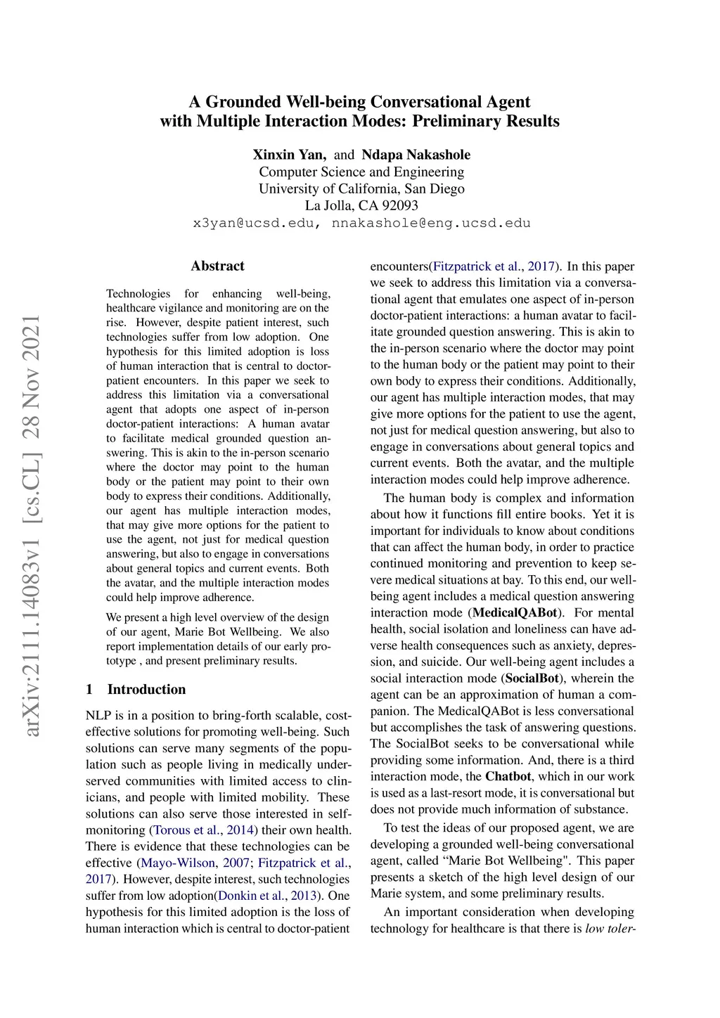 Technologies for enhancing well-being, healthcare vigilance and monitoring are on the rise. However, despite patient interest, such technologies suffer from low adoption. One hypothesis for this limited adoption is loss of human interaction that is central to doctor-patient encounters. In this paper we seek to address this limitation via a conversational agent that adopts one aspect of in-person doctor-patient interactions: A human avatar to facilitate medical grounded question answering. This is akin to the in-person scenario where the doctor may point to the human body or the patient may point to their own body to express their conditions. Additionally, our agent has multiple interaction modes, that may give more options for the patient to use the agent, not just for medical question answering, but also to engage in conversations about general topics and current events. Both the avatar, and the multiple interaction modes could help improve adherence. We present a high level overview of the design of our agent, Marie Bot Wellbeing. We also report implementation details of our early prototype , and present preliminary results.