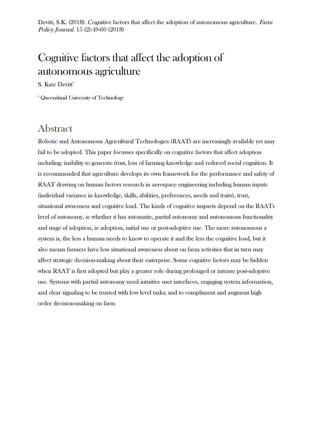 Robotic and Autonomous Agricultural Technologies (RAAT) are increasingly available yet may fail to be adopted. This paper focusses specifically on cognitive factors that affect adoption including: inability to generate trust, loss of farming knowledge and reduced social cognition. It is recommended that agriculture develops its own framework for the performance and safety of RAAT drawing on human factors research in aerospace engineering including human inputs (individual variance in knowledge, skills, abilities, preferences, needs and traits), trust, situational awareness and cognitive load. The kinds of cognitive impacts depend on the RAATs level of autonomy, ie whether it has automatic, partial autonomy and autonomous functionality and stage of adoption, ie adoption, initial use or post-adoptive use. The more autonomous a system is, the less a human needs to know to operate it and the less the cognitive load, but it also means farmers have less situational awareness about on farm activities that in turn may affect strategic decision-making about their enterprise. Some cognitive factors may be hidden when RAAT is first adopted but play a greater role during prolonged or intense post-adoptive use. Systems with partial autonomy need intuitive user interfaces, engaging system information, and clear signaling to be trusted with low level tasks; and to compliment and augment high order decision-making on farm.