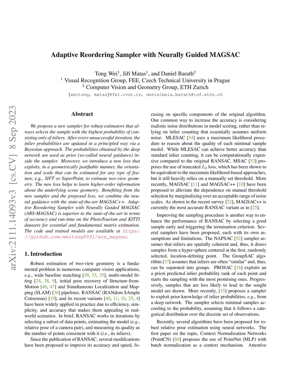 We propose a new sampler for robust estimators that always selects the sample with the highest probability of consisting only of inliers. After every unsuccessful iteration, the inlier probabilities are updated in a principled way via a Bayesian approach. The probabilities obtained by the deep network are used as prior (so-called neural guidance) inside the sampler. Moreover, we introduce a new loss that exploits, in a geometrically justifiable manner, the orientation and scale that can be estimated for any type of feature, e.g., SIFT or SuperPoint, to estimate two-view geometry. The new loss helps to learn higher-order information about the underlying scene geometry. Benefiting from the new sampler and the proposed loss, we combine the neural guidance with the state-of-the-art MAGSAC++. Adaptive Reordering Sampler with Neurally Guided MAGSAC (ARS-MAGSAC) is superior to the state-of-the-art in terms of accuracy and run-time on the PhotoTourism and KITTI datasets for essential and fundamental matrix estimation. The code and trained models are available at https://github.com/weitong8591/ars_magsac.