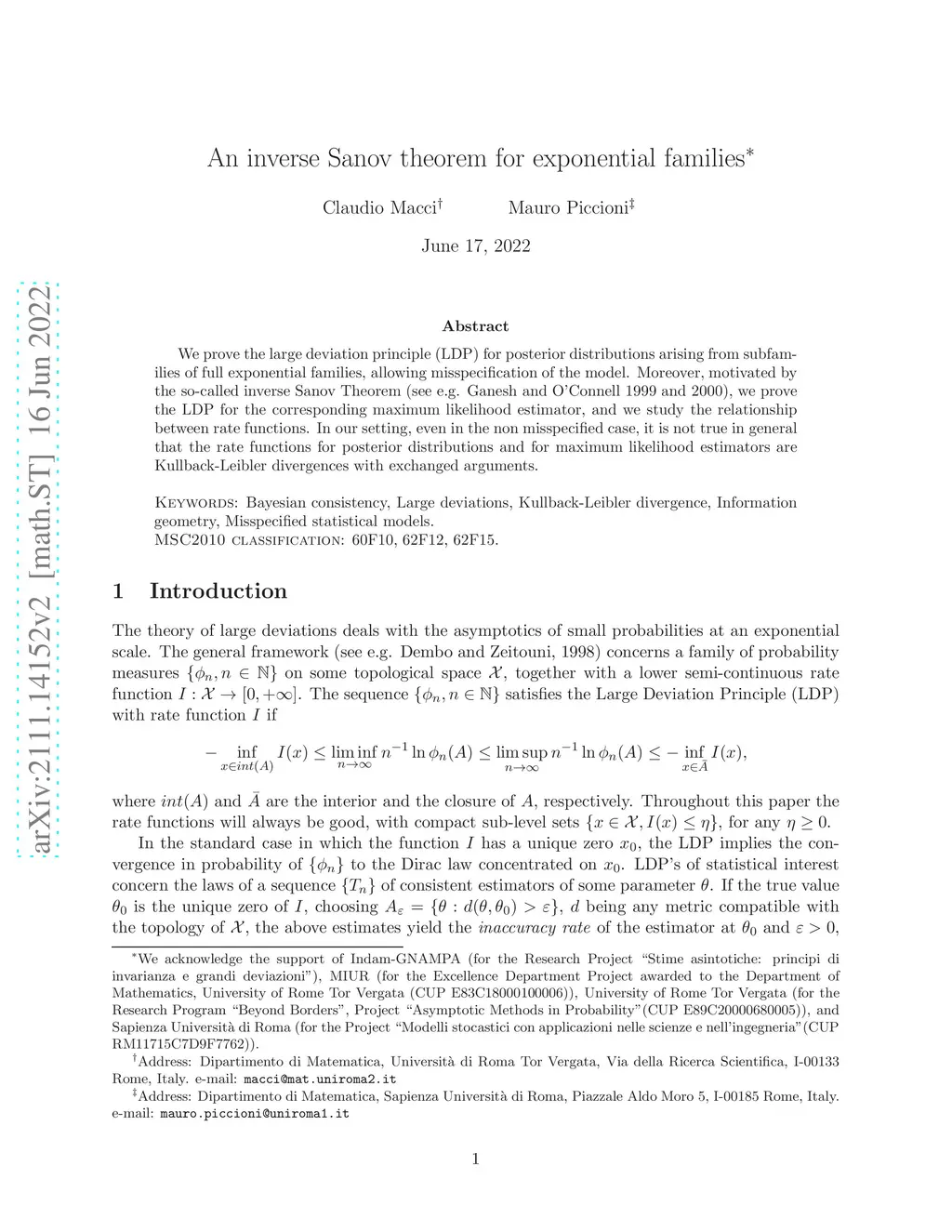 We prove the large deviation principle (LDP) for posterior distributions arising from subfamilies of full exponential families, allowing misspecification of the model. Moreover, motivated by the so-called inverse Sanov Theorem (see e.g. Ganesh and O'Connell 1999 and 2000), we prove the LDP for the corresponding maximum likelihood estimator, and we study the relationship between rate functions. In our setting, even in the non misspecified case, it is not true in general that the rate functions for posterior distributions and for maximum likelihood estimators are Kullback-Leibler divergences with exchanged arguments.