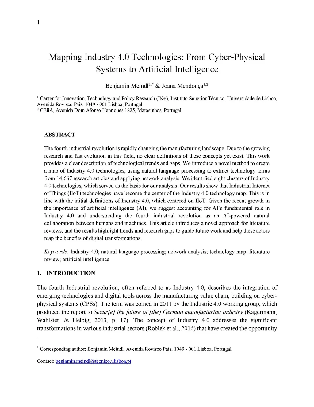 The fourth industrial revolution is rapidly changing the manufacturing landscape. Due to the growing research and fast evolution in this field, no clear definitions of these concepts yet exist. This work provides a clear description of technological trends and gaps. We introduce a novel method to create a map of Industry 4.0 technologies, using natural language processing to extract technology terms from 14,667 research articles and applying network analysis. We identified eight clusters of Industry 4.0 technologies, which served as the basis for our analysis. Our results show that Industrial Internet of Things (IIoT) technologies have become the center of the Industry 4.0 technology map. This is in line with the initial definitions of Industry 4.0, which centered on IIoT. Given the recent growth in the importance of artificial intelligence (AI), we suggest accounting for AI's fundamental role in Industry 4.0 and understanding the fourth industrial revolution as an AI-powered natural collaboration between humans and machines. This article introduces a novel approach for literature reviews, and the results highlight trends and research gaps to guide future work and help these actors reap the benefits of digital transformations.