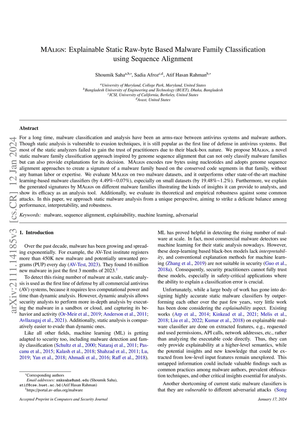 For a long time, malware classification and analysis have been an arms-race between antivirus systems and malware authors. Though static analysis is vulnerable to evasion techniques, it is still popular as the first line of defense in antivirus systems. But most of the static analyzers failed to gain the trust of practitioners due to their black-box nature. We propose MAlign, a novel static malware family classification approach inspired by genome sequence alignment that can not only classify malware families but can also provide explanations for its decision. MAlign encodes raw bytes using nucleotides and adopts genome sequence alignment approaches to create a signature of a malware family based on the conserved code segments in that family, without any human labor or expertise. We evaluate MAlign on two malware datasets, and it outperforms other state-of-the-art machine learning based malware classifiers (by 4.49% - 0.07%), especially on small datasets (by 19.48% - 1.2%). Furthermore, we explain the generated signatures by MAlign on different malware families illustrating the kinds of insights it can provide to analysts, and show its efficacy as an analysis tool. Additionally, we evaluate its theoretical and empirical robustness against some common attacks. In this paper, we approach static malware analysis from a unique perspective, aiming to strike a delicate balance among performance, interpretability, and robustness.