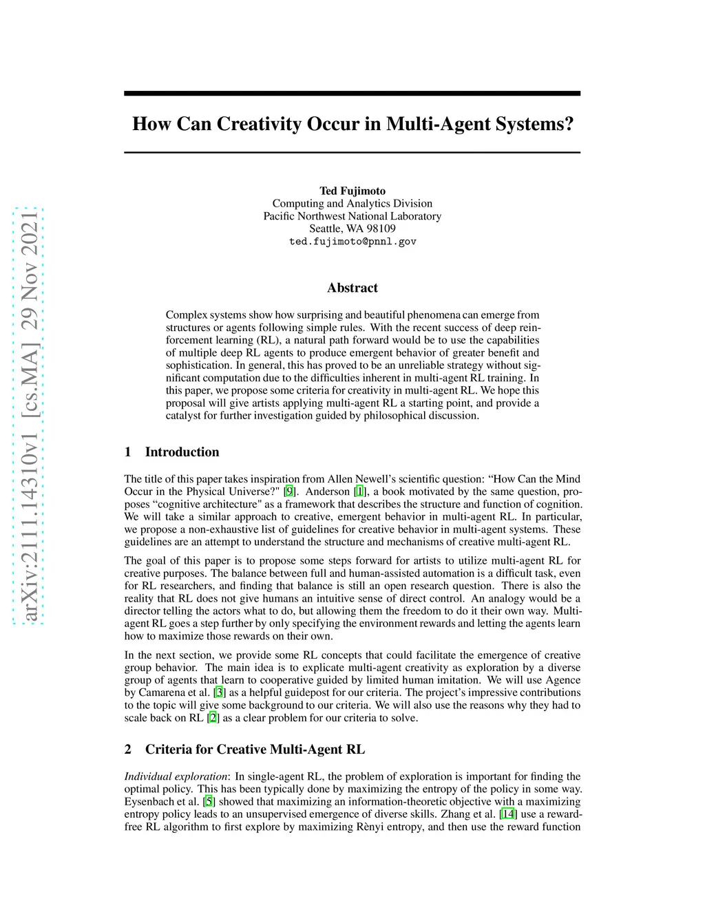 Complex systems show how surprising and beautiful phenomena can emerge from structures or agents following simple rules. With the recent success of deep reinforcement learning (RL), a natural path forward would be to use the capabilities of multiple deep RL agents to produce emergent behavior of greater benefit and sophistication. In general, this has proved to be an unreliable strategy without significant computation due to the difficulties inherent in multi-agent RL training. In this paper, we propose some criteria for creativity in multi-agent RL. We hope this proposal will give artists applying multi-agent RL a starting point, and provide a catalyst for further investigation guided by philosophical discussion.
