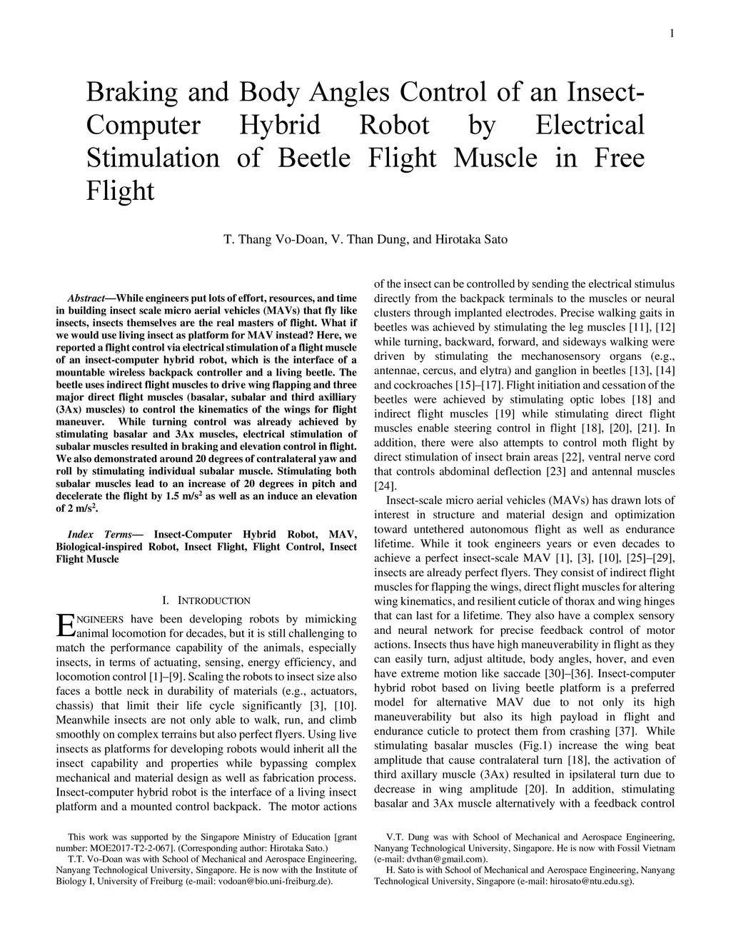 While engineers put lots of effort, resources, and time in building insect scale micro aerial vehicles (MAVs) that fly like insects, insects themselves are the real masters of flight. What if we would use living insect as platform for MAV instead? Here, we reported a flight control via electrical stimulation of a flight muscle of an insect-computer hybrid robot, which is the interface of a mountable wireless backpack controller and a living beetle. The beetle uses indirect flight muscles to drive wing flapping and three major direct flight muscles (basalar, subalar and third axilliary (3Ax) muscles) to control the kinematics of the wings for flight maneuver. While turning control was already achieved by stimulating basalar and 3Ax muscles, electrical stimulation of subalar muscles resulted in braking and elevation control in flight. We also demonstrated around 20 degrees of contralateral yaw and roll by stimulating individual subalar muscle. Stimulating both subalar muscles lead to an increase of 20 degrees in pitch and decelerate the flight by 1.5 m/s2 as well as an induce an elevation of 2 m/s2.