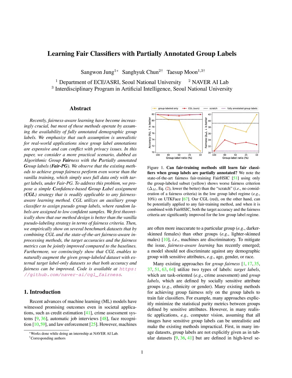 Recently, fairness-aware learning have become increasingly crucial, but most of those methods operate by assuming the availability of fully annotated demographic group labels. We emphasize that such assumption is unrealistic for real-world applications since group label annotations are expensive and can conflict with privacy issues. In this paper, we consider a more practical scenario, dubbed as Algorithmic Group Fairness with the Partially annotated Group labels (Fair-PG). We observe that the existing methods to achieve group fairness perform even worse than the vanilla training, which simply uses full data only with target labels, under Fair-PG. To address this problem, we propose a simple Confidence-based Group Label assignment (CGL) strategy that is readily applicable to any fairness-aware learning method. CGL utilizes an auxiliary group classifier to assign pseudo group labels, where random labels are assigned to low confident samples. We first theoretically show that our method design is better than the vanilla pseudo-labeling strategy in terms of fairness criteria. Then, we empirically show on several benchmark datasets that by combining CGL and the state-of-the-art fairness-aware in-processing methods, the target accuracies and the fairness metrics can be jointly improved compared to the baselines. Furthermore, we convincingly show that CGL enables to naturally augment the given group-labeled dataset with external target label-only datasets so that both accuracy and fairness can be improved. Code is available at https://github.com/naver-ai/cgl_fairness.