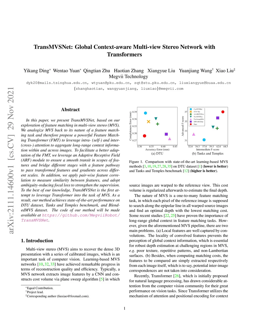 In this paper, we present TransMVSNet, based on our exploration of feature matching in multi-view stereo (MVS). We analogize MVS back to its nature of a feature matching task and therefore propose a powerful Feature Matching Transformer (FMT) to leverage intra- (self-) and inter- (cross-) attention to aggregate long-range context information within and across images. To facilitate a better adaptation of the FMT, we leverage an Adaptive Receptive Field (ARF) module to ensure a smooth transit in scopes of features and bridge different stages with a feature pathway to pass transformed features and gradients across different scales. In addition, we apply pair-wise feature correlation to measure similarity between features, and adopt ambiguity-reducing focal loss to strengthen the supervision. To the best of our knowledge, TransMVSNet is the first attempt to leverage Transformer into the task of MVS. As a result, our method achieves state-of-the-art performance on DTU dataset, Tanks and Temples benchmark, and BlendedMVS dataset. The code of our method will be made available at https://github.com/MegviiRobot/TransMVSNet .