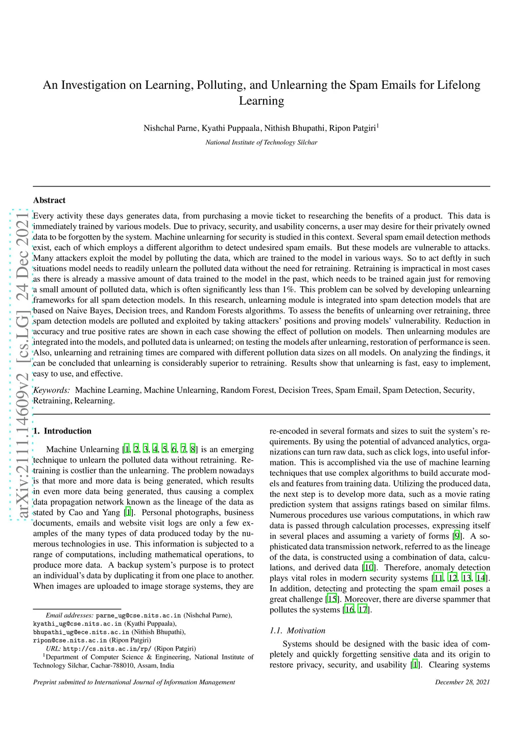 Machine unlearning for security is studied in this context. Several spam email detection methods exist, each of which employs a different algorithm to detect undesired spam emails. But these models are vulnerable to attacks. Many attackers exploit the model by polluting the data, which are trained to the model in various ways. So to act deftly in such situations model needs to readily unlearn the polluted data without the need for retraining. Retraining is impractical in most cases as there is already a massive amount of data trained to the model in the past, which needs to be trained again just for removing a small amount of polluted data, which is often significantly less than 1%. This problem can be solved by developing unlearning frameworks for all spam detection models. In this research, unlearning module is integrated into spam detection models that are based on Naive Bayes, Decision trees, and Random Forests algorithms. To assess the benefits of unlearning over retraining, three spam detection models are polluted and exploited by taking attackers' positions and proving models' vulnerability. Reduction in accuracy and true positive rates are shown in each case showing the effect of pollution on models. Then unlearning modules are integrated into the models, and polluted data is unlearned; on testing the models after unlearning, restoration of performance is seen. Also, unlearning and retraining times are compared with different pollution data sizes on all models. On analyzing the findings, it can be concluded that unlearning is considerably superior to retraining. Results show that unlearning is fast, easy to implement, easy to use, and effective.