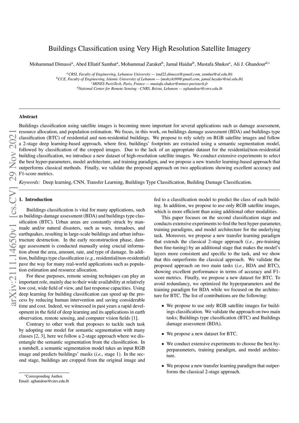 Buildings classification using satellite images is becoming more important for several applications such as damage assessment, resource allocation, and population estimation. We focus, in this work, on buildings damage assessment (BDA) and buildings type classification (BTC) of residential and non-residential buildings. We propose to rely solely on RGB satellite images and follow a 2-stage deep learning-based approach, where first, buildings' footprints are extracted using a semantic segmentation model, followed by classification of the cropped images. Due to the lack of an appropriate dataset for the residential/non-residential building classification, we introduce a new dataset of high-resolution satellite images. We conduct extensive experiments to select the best hyper-parameters, model architecture, and training paradigm, and we propose a new transfer learning-based approach that outperforms classical methods. Finally, we validate the proposed approach on two applications showing excellent accuracy and F1-score metrics.