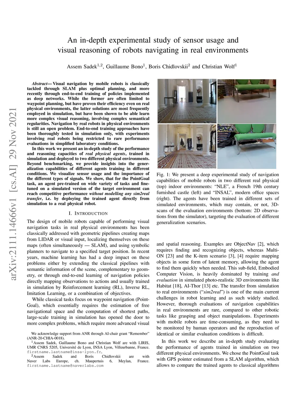 Visual navigation by mobile robots is classically tackled through SLAM plus optimal planning, and more recently through end-to-end training of policies implemented as deep networks. While the former are often limited to waypoint planning, but have proven their efficiency even on real physical environments, the latter solutions are most frequently employed in simulation, but have been shown to be able learn more complex visual reasoning, involving complex semantical regularities. Navigation by real robots in physical environments is still an open problem. End-to-end training approaches have been thoroughly tested in simulation only, with experiments involving real robots being restricted to rare performance evaluations in simplified laboratory conditions. In this work we present an in-depth study of the performance and reasoning capacities of real physical agents, trained in simulation and deployed to two different physical environments. Beyond benchmarking, we provide insights into the generalization capabilities of different agents training in different conditions. We visualize sensor usage and the importance of the different types of signals. We show, that for the PointGoal task, an agent pre-trained on wide variety of tasks and fine-tuned on a simulated version of the target environment can reach competitive performance without modelling any sim2real transfer, i.e. by deploying the trained agent directly from simulation to a real physical robot.
