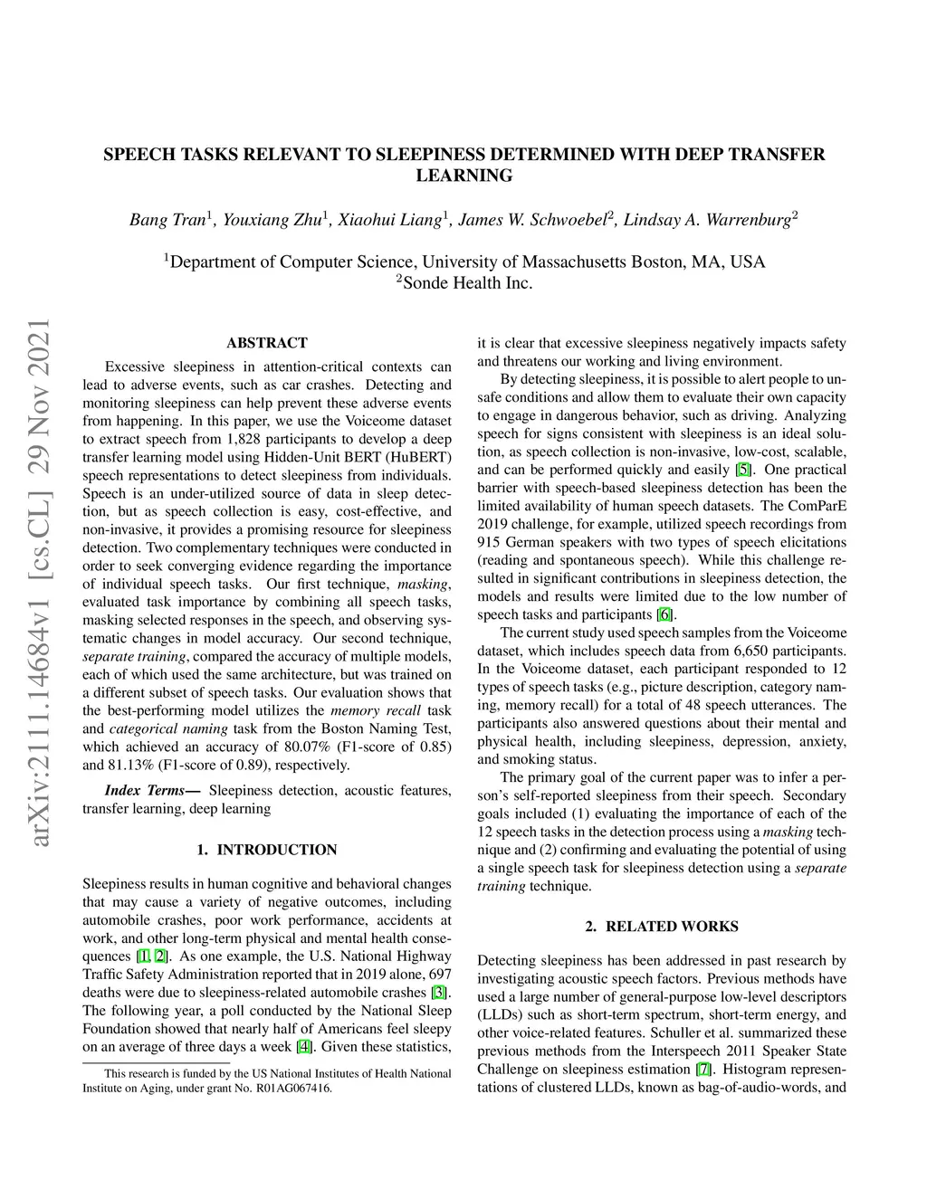 Excessive sleepiness in attention-critical contexts can lead to adverse events, such as car crashes. Detecting and monitoring sleepiness can help prevent these adverse events from happening. In this paper, we use the Voiceome dataset to extract speech from 1,828 participants to develop a deep transfer learning model using Hidden-Unit BERT (HuBERT) speech representations to detect sleepiness from individuals. Speech is an under-utilized source of data in sleep detection, but as speech collection is easy, cost-effective, and non-invasive, it provides a promising resource for sleepiness detection. Two complementary techniques were conducted in order to seek converging evidence regarding the importance of individual speech tasks. Our first technique, masking, evaluated task importance by combining all speech tasks, masking selected responses in the speech, and observing systematic changes in model accuracy. Our second technique, separate training, compared the accuracy of multiple models, each of which used the same architecture, but was trained on a different subset of speech tasks. Our evaluation shows that the best-performing model utilizes the memory recall task and categorical naming task from the Boston Naming Test, which achieved an accuracy of 80.07% (F1-score of 0.85) and 81.13% (F1-score of 0.89), respectively.