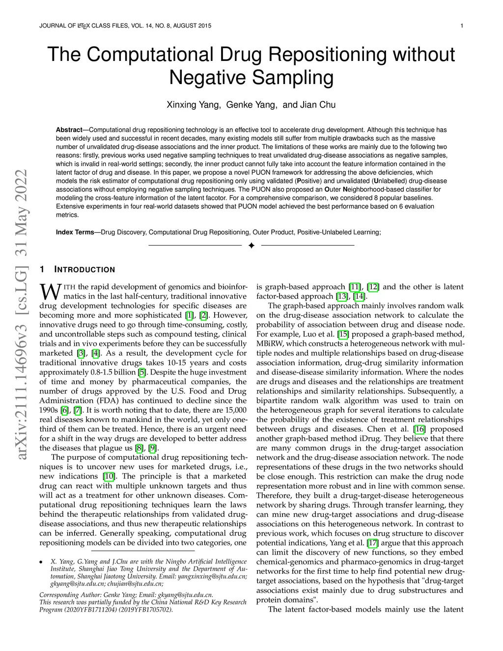 Computational drug repositioning technology is an effective tool to accelerate drug development. Although this technique has been widely used and successful in recent decades, many existing models still suffer from multiple drawbacks such as the massive number of unvalidated drug-disease associations and the inner product. The limitations of these works are mainly due to the following two reasons: firstly, previous works used negative sampling techniques to treat unvalidated drug-disease associations as negative samples, which is invalid in real-world settings; secondly, the inner product cannot fully take into account the feature information contained in the latent factor of drug and disease. In this paper, we propose a novel PUON framework for addressing the above deficiencies, which models the risk estimator of computational drug repositioning only using validated (Positive) and unvalidated (Unlabelled) drug-disease associations without employing negative sampling techniques. The PUON also proposed an Outer Neighborhood-based classifier for modeling the cross-feature information of the latent facotor. For a comprehensive comparison, we considered 8 popular baselines. Extensive experiments in four real-world datasets showed that PUON model achieved the best performance based on 6 evaluation metrics.