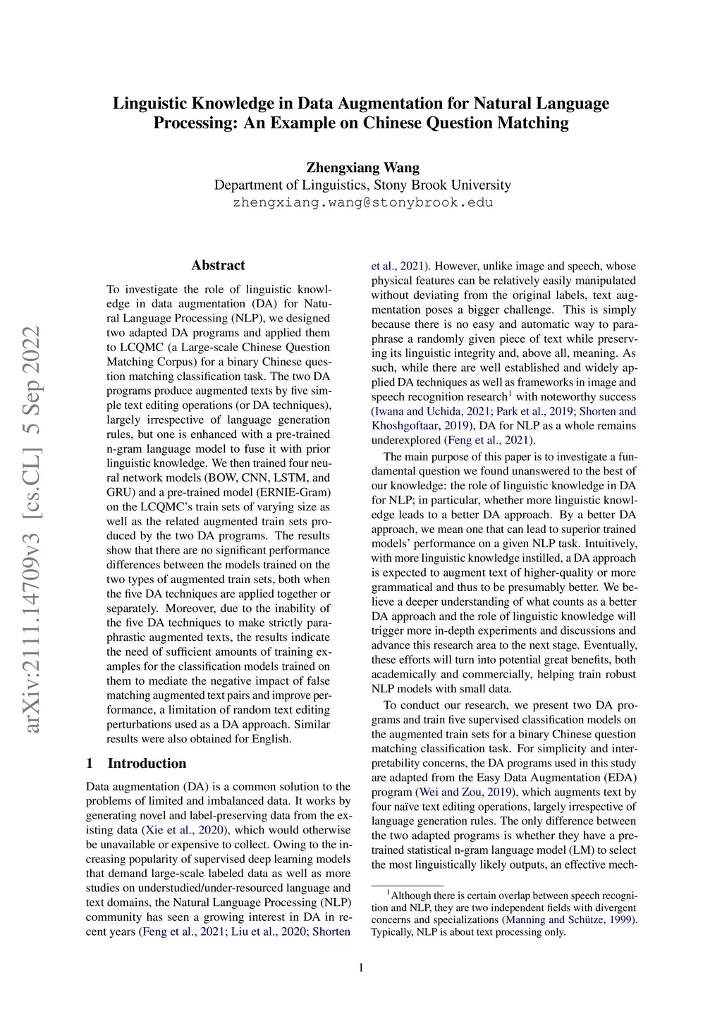 To investigate the role of linguistic knowledge in data augmentation (DA) for Natural Language Processing (NLP), we designed two adapted DA programs and applied them to LCQMC (a Large-scale Chinese Question Matching Corpus) for a binary Chinese question matching classification task. The two DA programs produce augmented texts by five simple text editing operations (or DA techniques), largely irrespective of language generation rules, but one is enhanced with a pre-trained n-gram language model to fuse it with prior linguistic knowledge. We then trained four neural network models (BOW, CNN, LSTM, and GRU) and a pre-trained model (ERNIE-Gram) on the LCQMCs train sets of varying size as well as the related augmented train sets produced by the two DA programs. The results show that there are no significant performance differences between the models trained on the two types of augmented train sets, both when the five DA techniques are applied together or separately. Moreover, due to the inability of the five DA techniques to make strictly paraphrastic augmented texts, the results indicate the need of sufficient amounts of training examples for the classification models trained on them to mediate the negative impact of false matching augmented text pairs and improve performance, a limitation of random text editing perturbations used as a DA approach. Similar results were also obtained for English.
