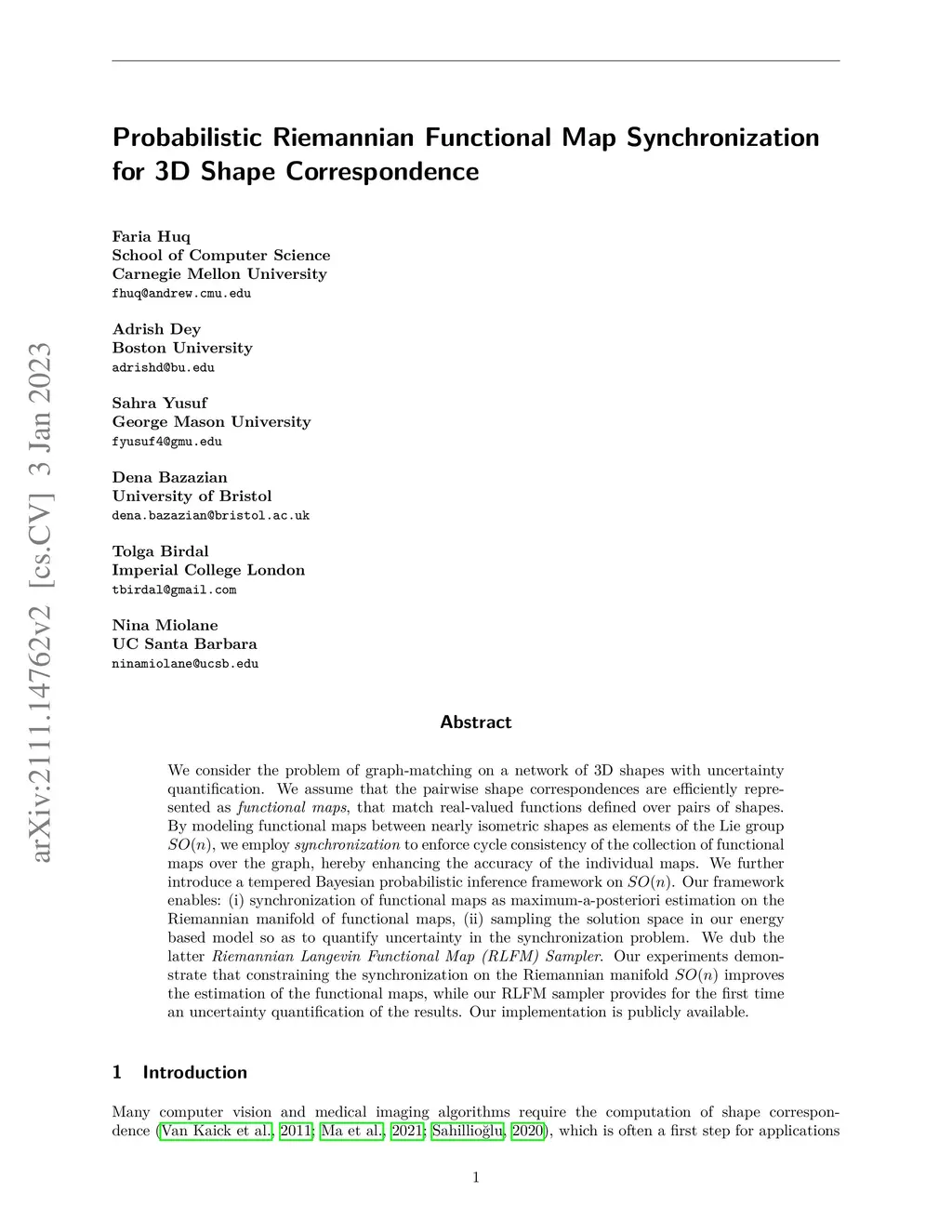 We consider the problem of graph-matching on a network of 3D shapes with uncertainty quantification. We assume that the pairwise shape correspondences are efficiently represented as \emph{functional maps}, that match real-valued functions defined over pairs of shapes. By modeling functional maps between nearly isometric shapes as elements of the Lie group , we employ \emph{synchronization} to enforce cycle consistency of the collection of functional maps over the graph, hereby enhancing the accuracy of the individual maps. We further introduce a tempered Bayesian probabilistic inference framework on . Our framework enables: (i) synchronization of functional maps as maximum-a-posteriori estimation on the Riemannian manifold of functional maps, (ii) sampling the solution space in our energy based model so as to quantify uncertainty in the synchronization problem. We dub the latter \emph{Riemannian Langevin Functional Map (RLFM) Sampler}. Our experiments demonstrate that constraining the synchronization on the Riemannian manifold improves the estimation of the functional maps, while our RLFM sampler provides for the first time an uncertainty quantification of the results.