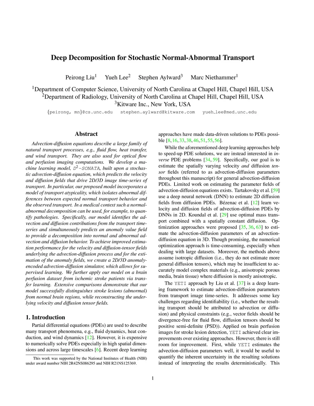 Advection-diffusion equations describe a large family of natural transport processes, e.g., fluid flow, heat transfer, and wind transport. They are also used for optical flow and perfusion imaging computations. We develop a machine learning model, D^2-SONATA, built upon a stochastic advection-diffusion equation, which predicts the velocity and diffusion fields that drive 2D/3D image time-series of transport. In particular, our proposed model incorporates a model of transport atypicality, which isolates abnormal differences between expected normal transport behavior and the observed transport. In a medical context such a normal-abnormal decomposition can be used, for example, to quantify pathologies. Specifically, our model identifies the advection and diffusion contributions from the transport time-series and simultaneously predicts an anomaly value field to provide a decomposition into normal and abnormal advection and diffusion behavior. To achieve improved estimation performance for the velocity and diffusion-tensor fields underlying the advection-diffusion process and for the estimation of the anomaly fields, we create a 2D/3D anomaly-encoded advection-diffusion simulator, which allows for supervised learning. We further apply our model on a brain perfusion dataset from ischemic stroke patients via transfer learning. Extensive comparisons demonstrate that our model successfully distinguishes stroke lesions (abnormal) from normal brain regions, while reconstructing the underlying velocity and diffusion tensor fields.