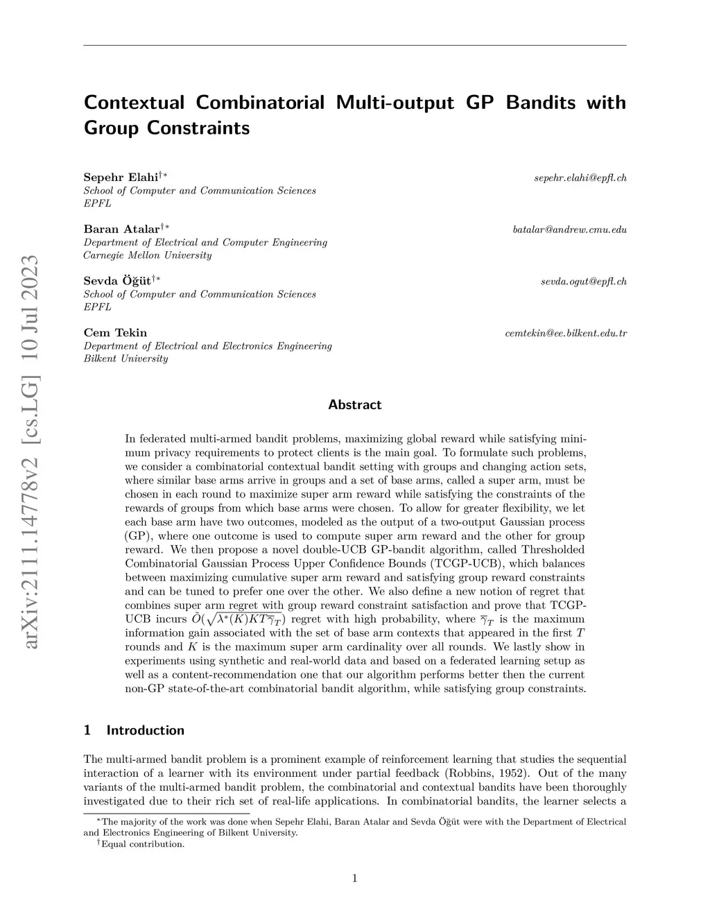 In federated multi-armed bandit problems, maximizing global reward while satisfying minimum privacy requirements to protect clients is the main goal. To formulate such problems, we consider a combinatorial contextual bandit setting with groups and changing action sets, where similar base arms arrive in groups and a set of base arms, called a super arm, must be chosen in each round to maximize super arm reward while satisfying the constraints of the rewards of groups from which base arms were chosen. To allow for greater flexibility, we let each base arm have two outcomes, modeled as the output of a two-output Gaussian process (GP), where one outcome is used to compute super arm reward and the other for group reward. We then propose a novel double-UCB GP-bandit algorithm, called Thresholded Combinatorial Gaussian Process Upper Confidence Bounds (TCGP-UCB), which balances between maximizing cumulative super arm reward and satisfying group reward constraints and can be tuned to prefer one over the other. We also define a new notion of regret that combines super arm regret with group reward constraint satisfaction and prove that TCGP-UCB incurs regret with high probability, where is the maximum information gain associated with the set of base arm contexts that appeared in the first rounds and is the maximum super arm cardinality over all rounds. We lastly show in experiments using synthetic and real-world data and based on a federated learning setup as well as a content-recommendation one that our algorithm performs better then the current non-GP state-of-the-art combinatorial bandit algorithm, while satisfying group constraints.