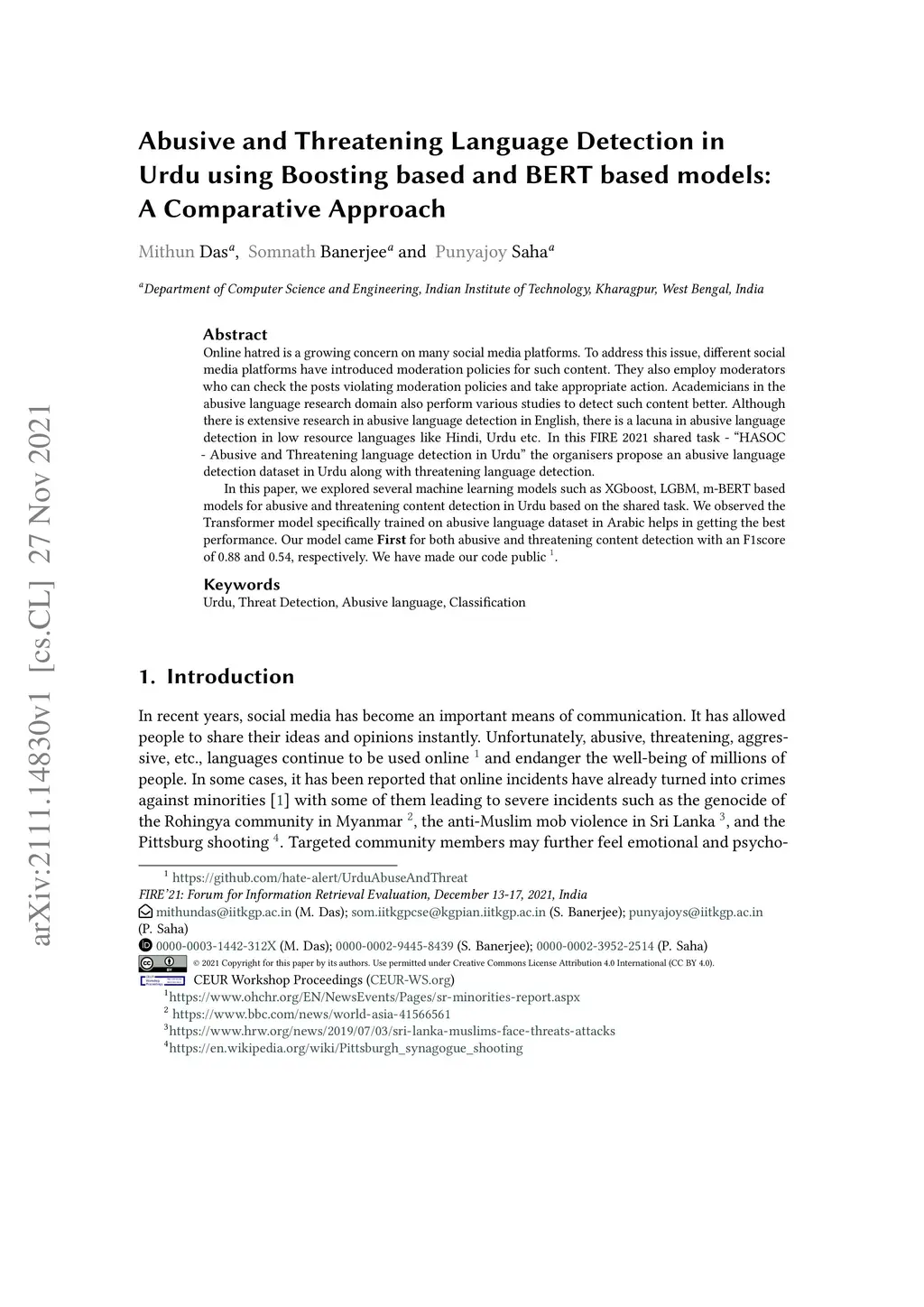 Online hatred is a growing concern on many social media platforms. To address this issue, different social media platforms have introduced moderation policies for such content. They also employ moderators who can check the posts violating moderation policies and take appropriate action. Academicians in the abusive language research domain also perform various studies to detect such content better. Although there is extensive research in abusive language detection in English, there is a lacuna in abusive language detection in low resource languages like Hindi, Urdu etc. In this FIRE 2021 shared task - "HASOC- Abusive and Threatening language detection in Urdu" the organizers propose an abusive language detection dataset in Urdu along with threatening language detection. In this paper, we explored several machine learning models such as XGboost, LGBM, m-BERT based models for abusive and threatening content detection in Urdu based on the shared task. We observed the Transformer model specifically trained on abusive language dataset in Arabic helps in getting the best performance. Our model came First for both abusive and threatening content detection with an F1scoreof 0.88 and 0.54, respectively.